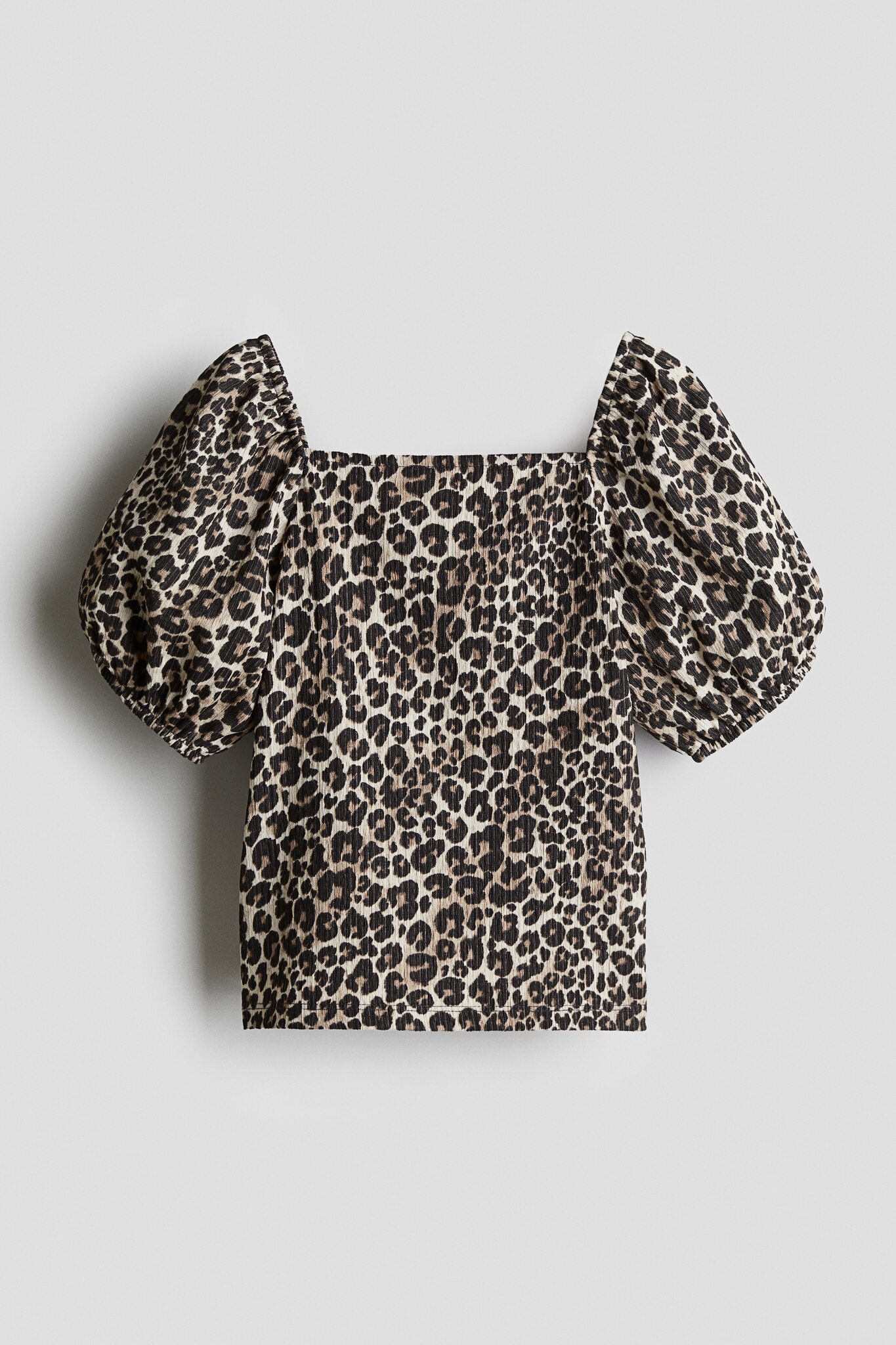 Топ из мягкого жатого трикотажа с квадратным вырезом, рукавами-буфами и узкой резинкой на манжетах.
