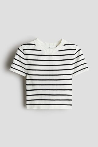 Мягкий топ из трикотажной резинки с короткими рукавами, круглым вырезом и необработанными краями на манжетах и подоле.