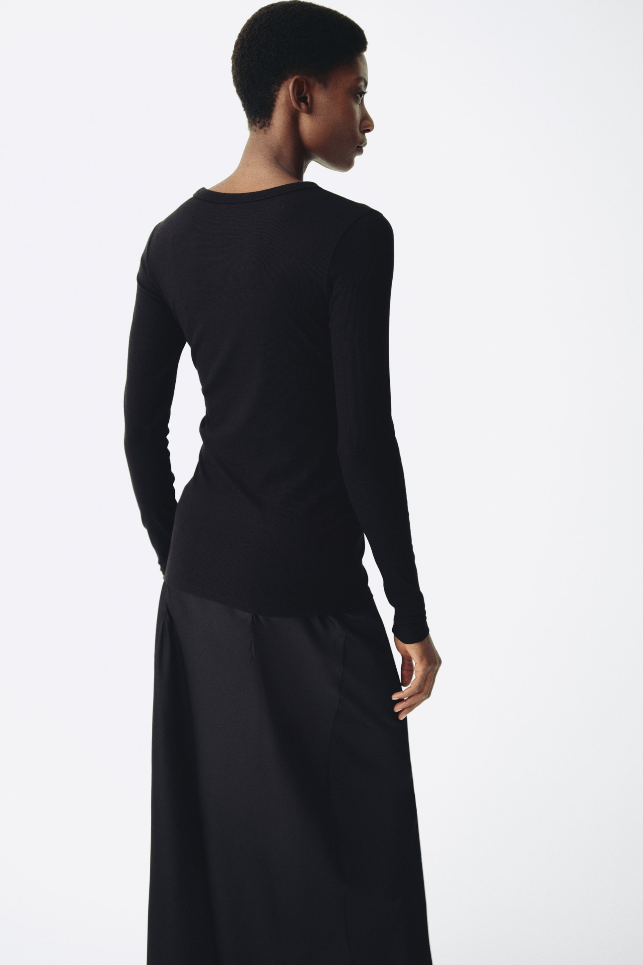 Приталенная футболка из ребристой вязки, сочетающей в себе хлопок и вискозу, с круглым вырезом и длинными рукавами.
