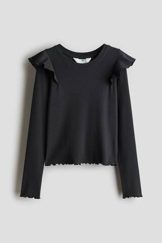Топ с длинными рукавами из мягкого хлопка и ребристого трикотажа с оверлочной отделкой. Круглый вырез горловины с ребристой отделкой и оборками на плечах.