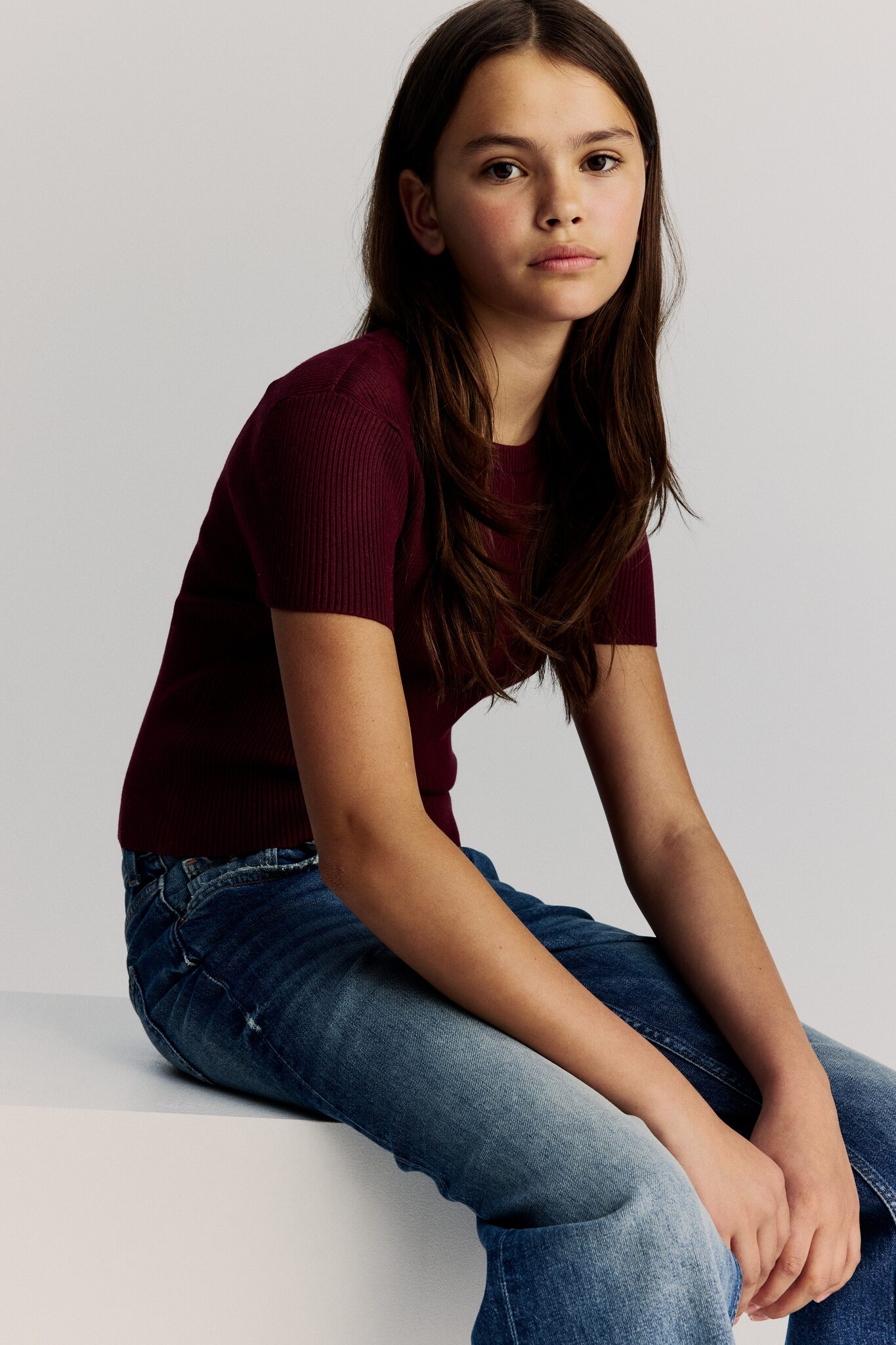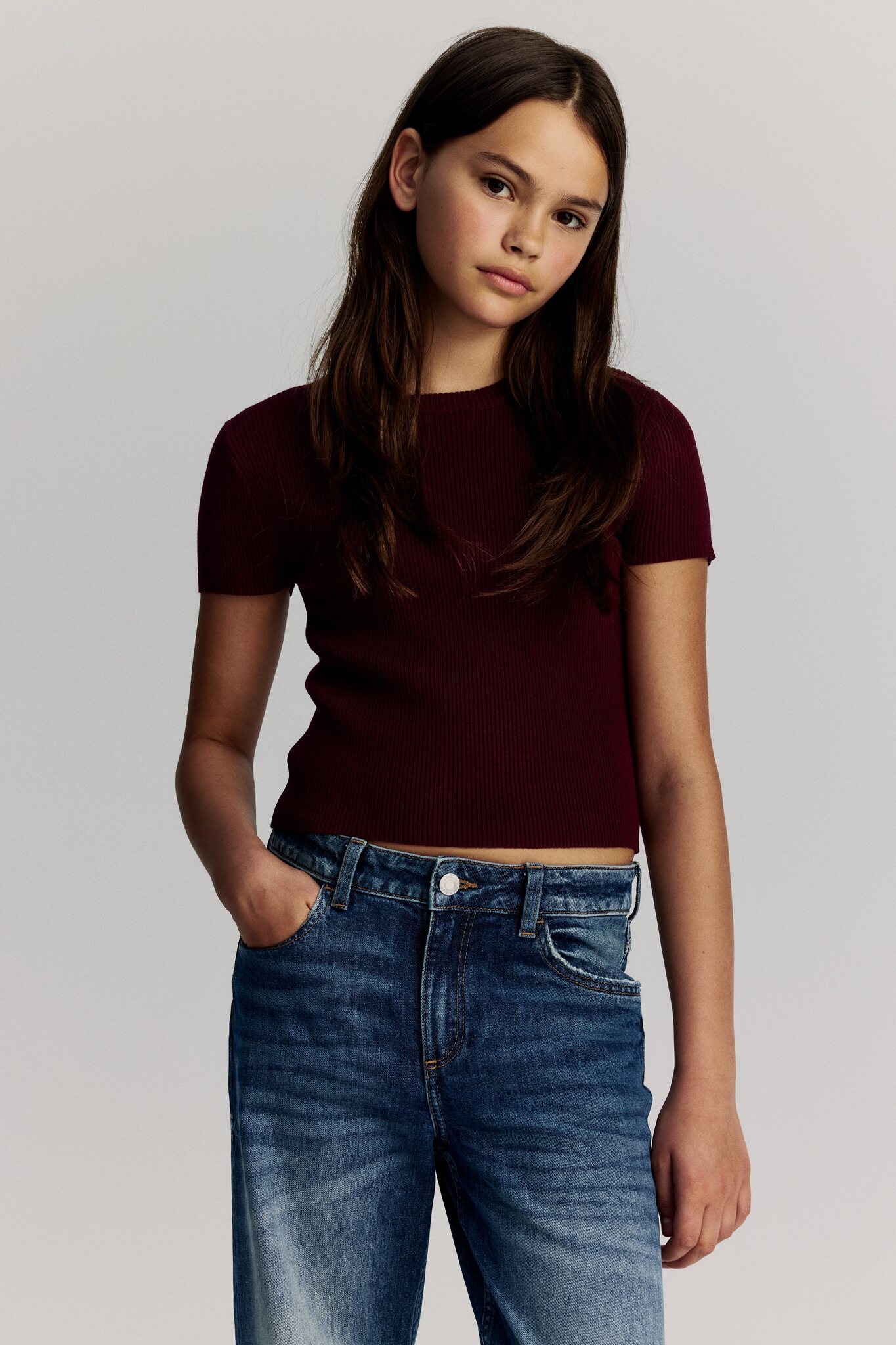 Мягкий трикотажный укороченный топ с круглым вырезом и короткими рукавами.