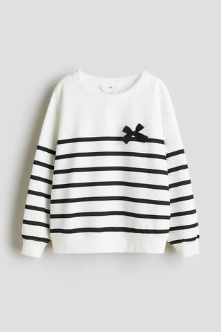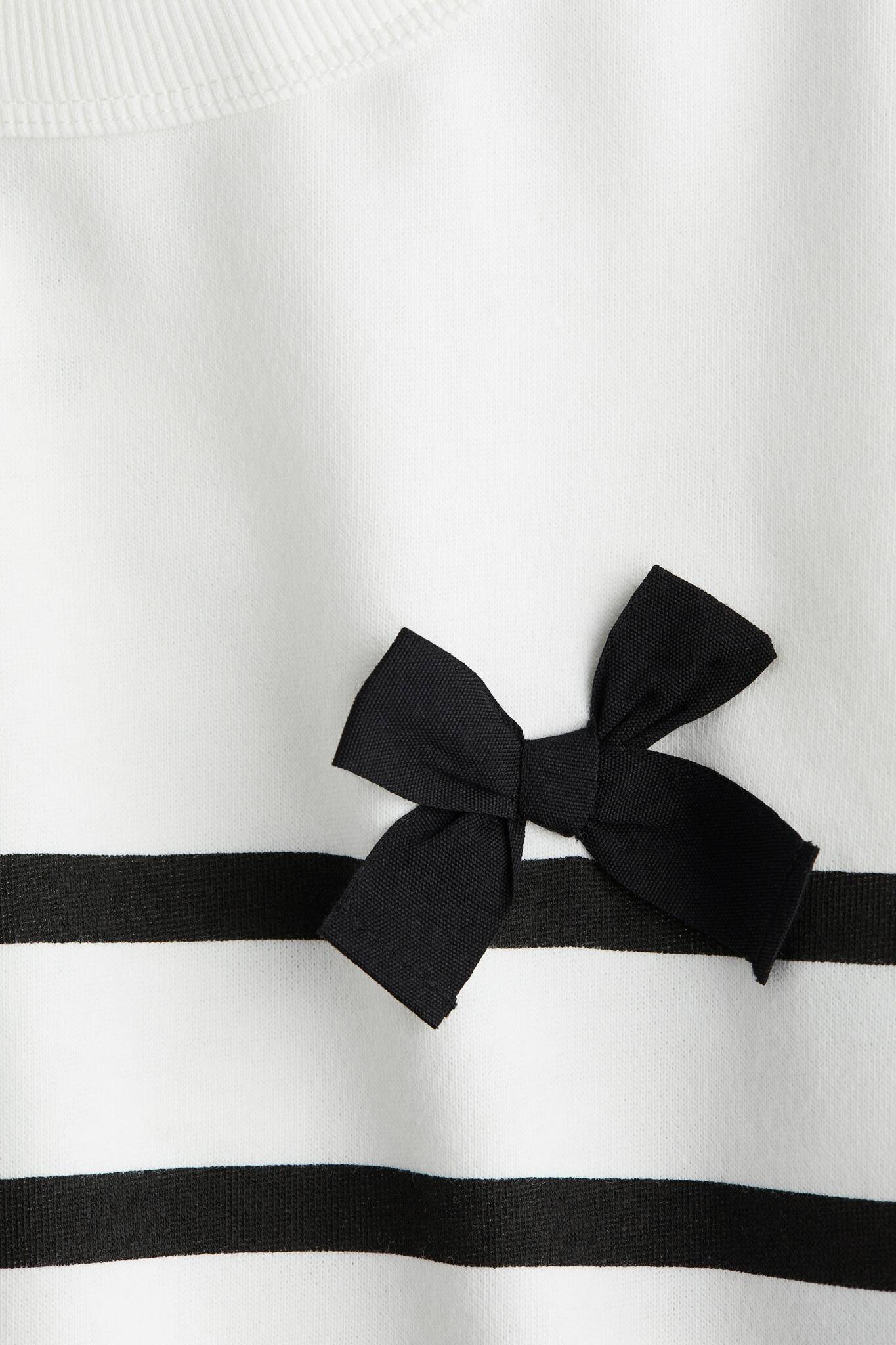 Свободный топ из лёгкого принтованного свитшота с круглым вырезом, отделкой резинкой, спущенной линией плеча и длинными рукавами. Манжеты и нижний край выполнены из резинки.