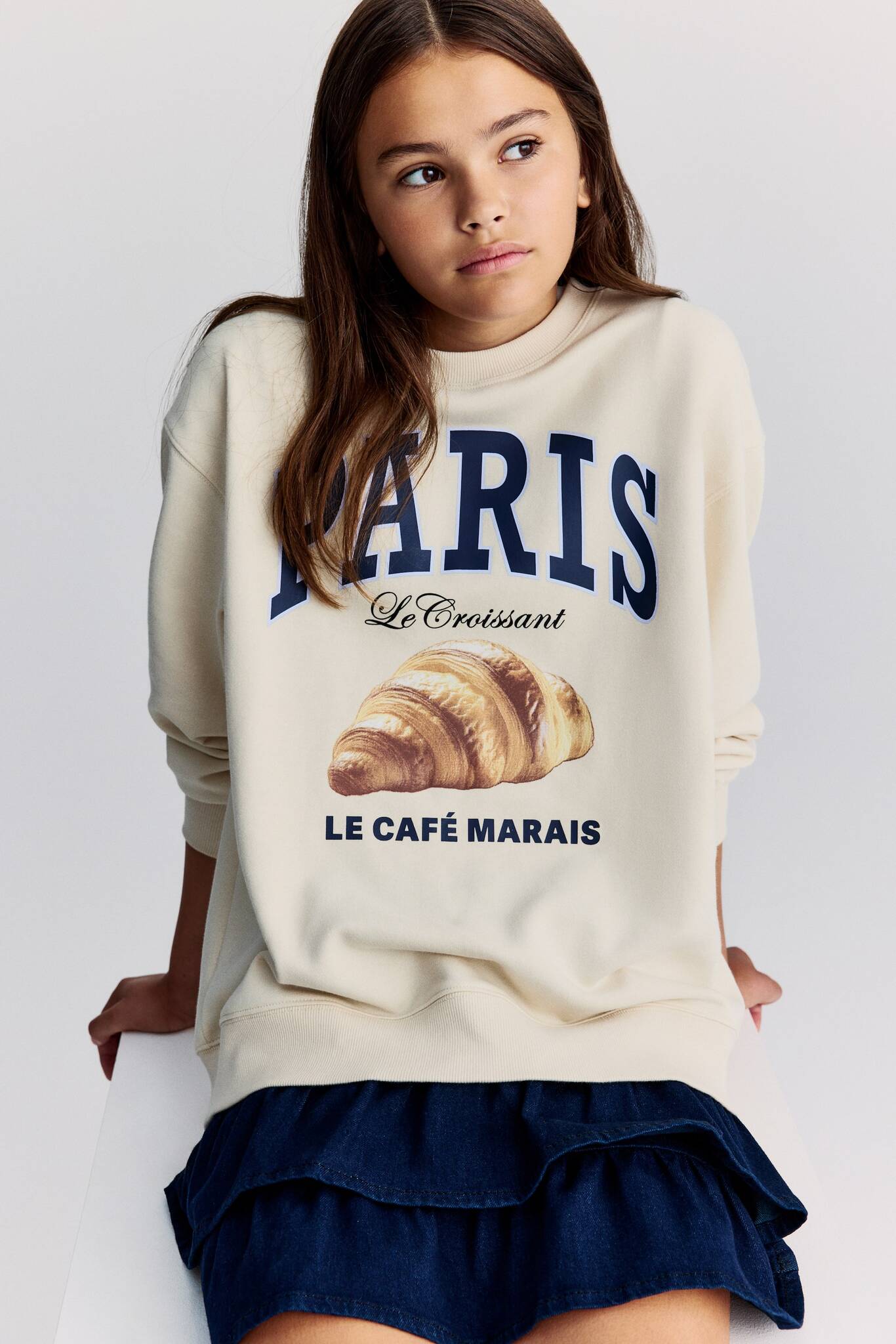 Свободный топ из лёгкого принтованного свитшота с круглым вырезом, отделкой резинкой, спущенной линией плеча и длинными рукавами. Манжеты и нижний край выполнены из резинки.