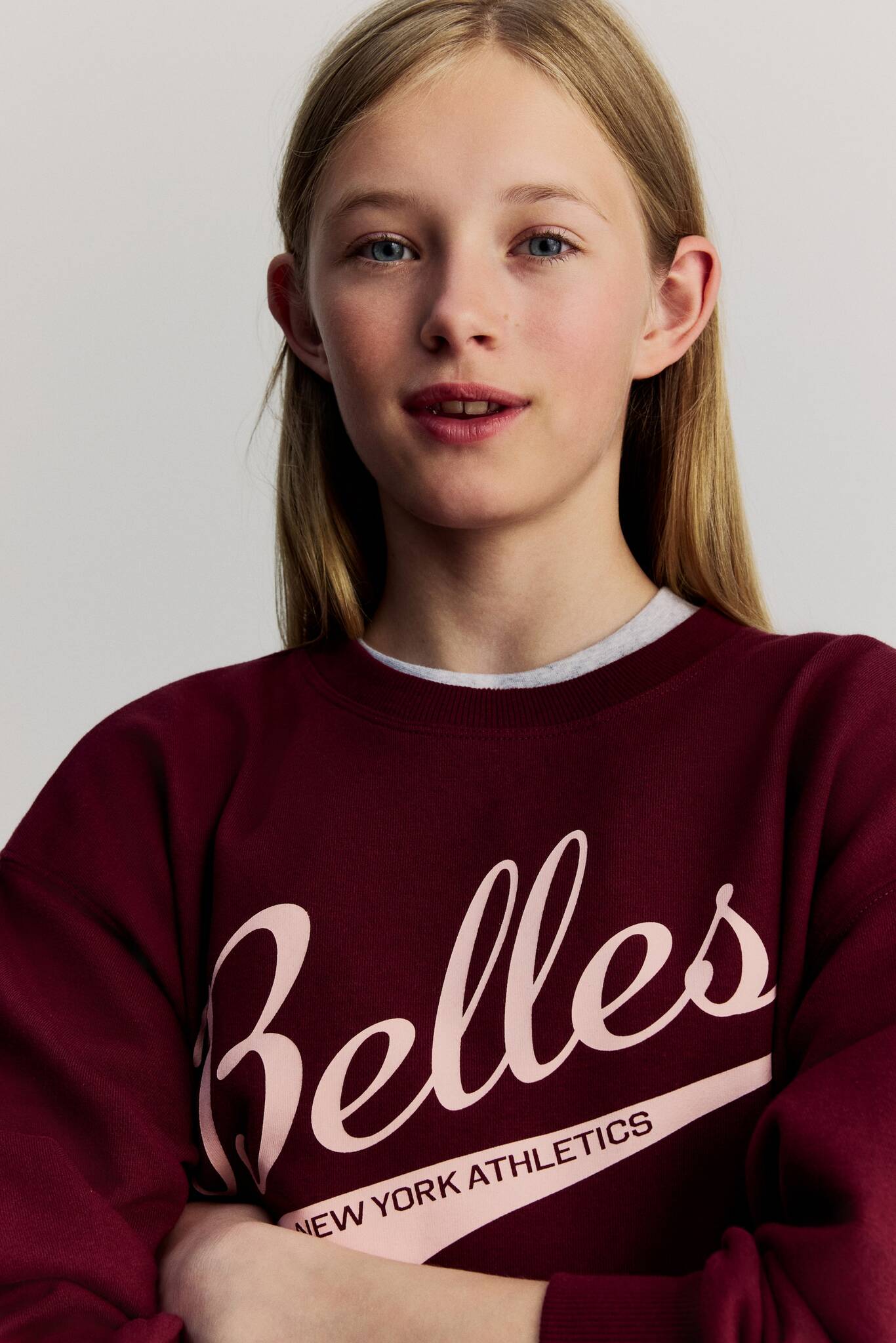 Свободный топ из лёгкого принтованного свитшота с круглым вырезом, отделкой резинкой, спущенной линией плеча и длинными рукавами. Манжеты и нижний край выполнены из резинки.