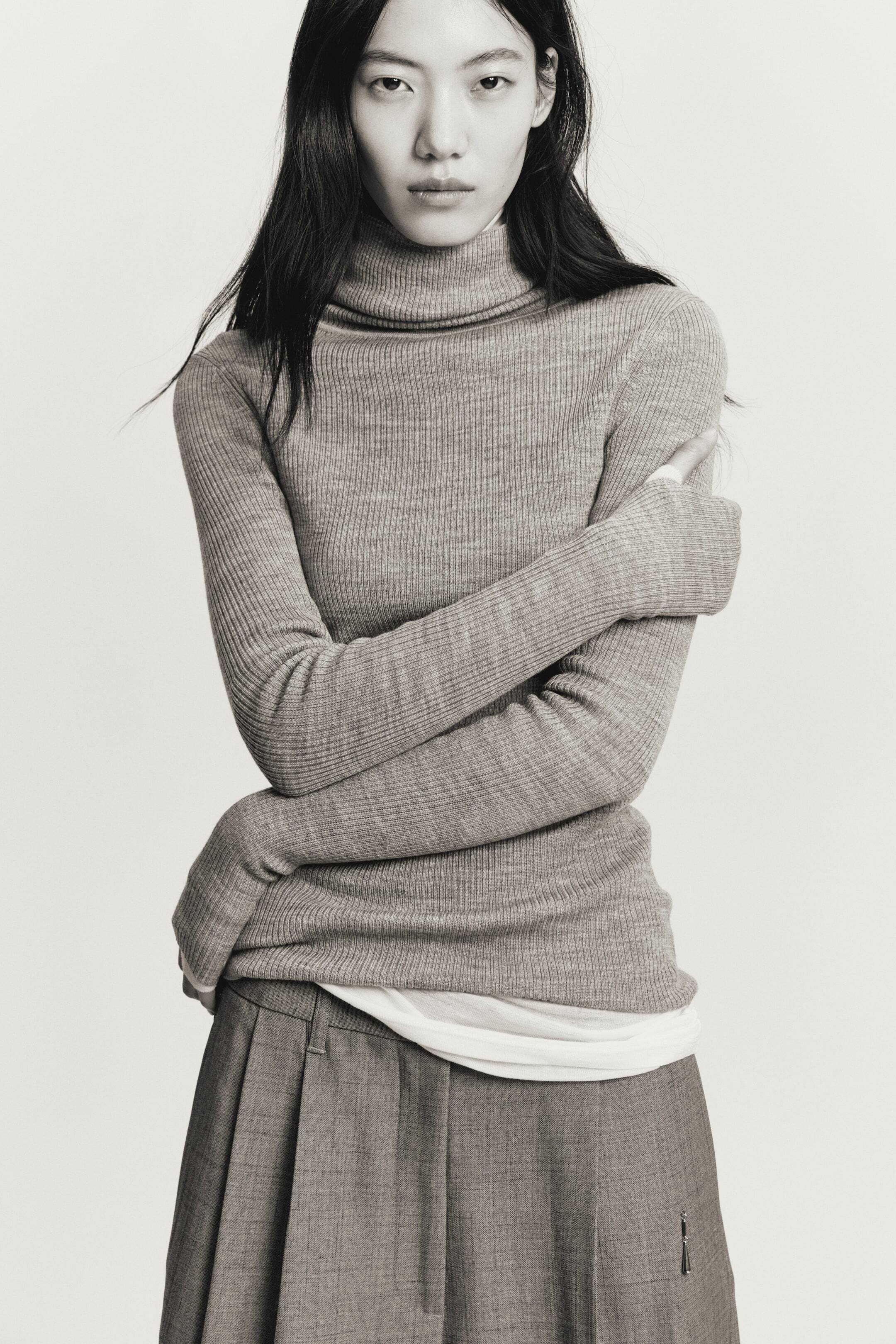 Облегающий топ из мягкой мериносовой шерсти в рубчик с водолазкой и удлиненными рукавами с прорезями для больших пальцев.