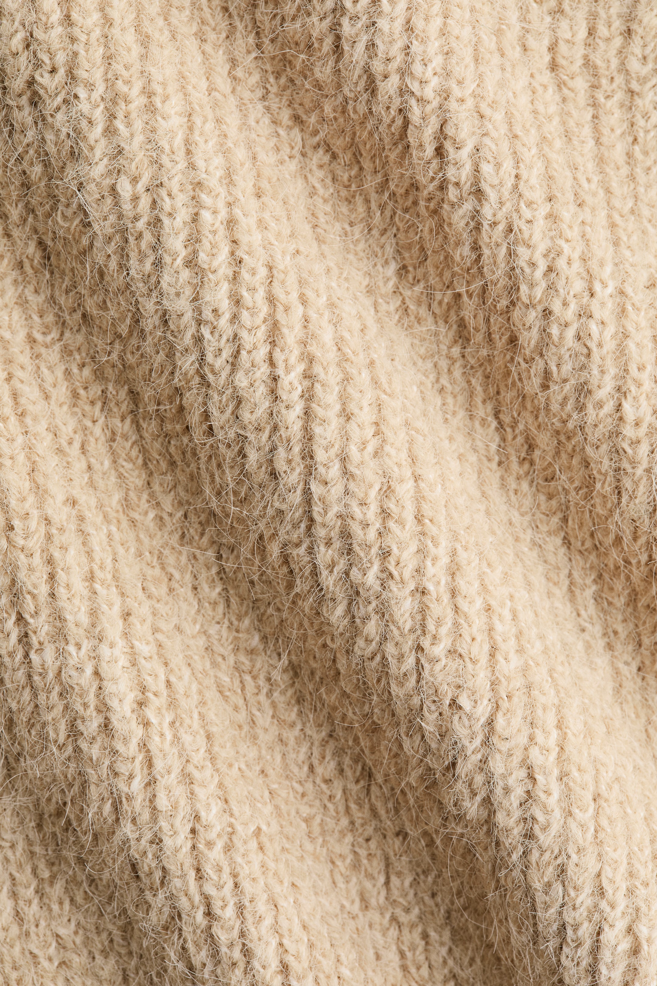 Мягкий свитер в рубчик. Свободный крой, круглый вырез горловины с отделкой в рубчик, приспущенные плечи, манжеты и нижний край в рубчик.