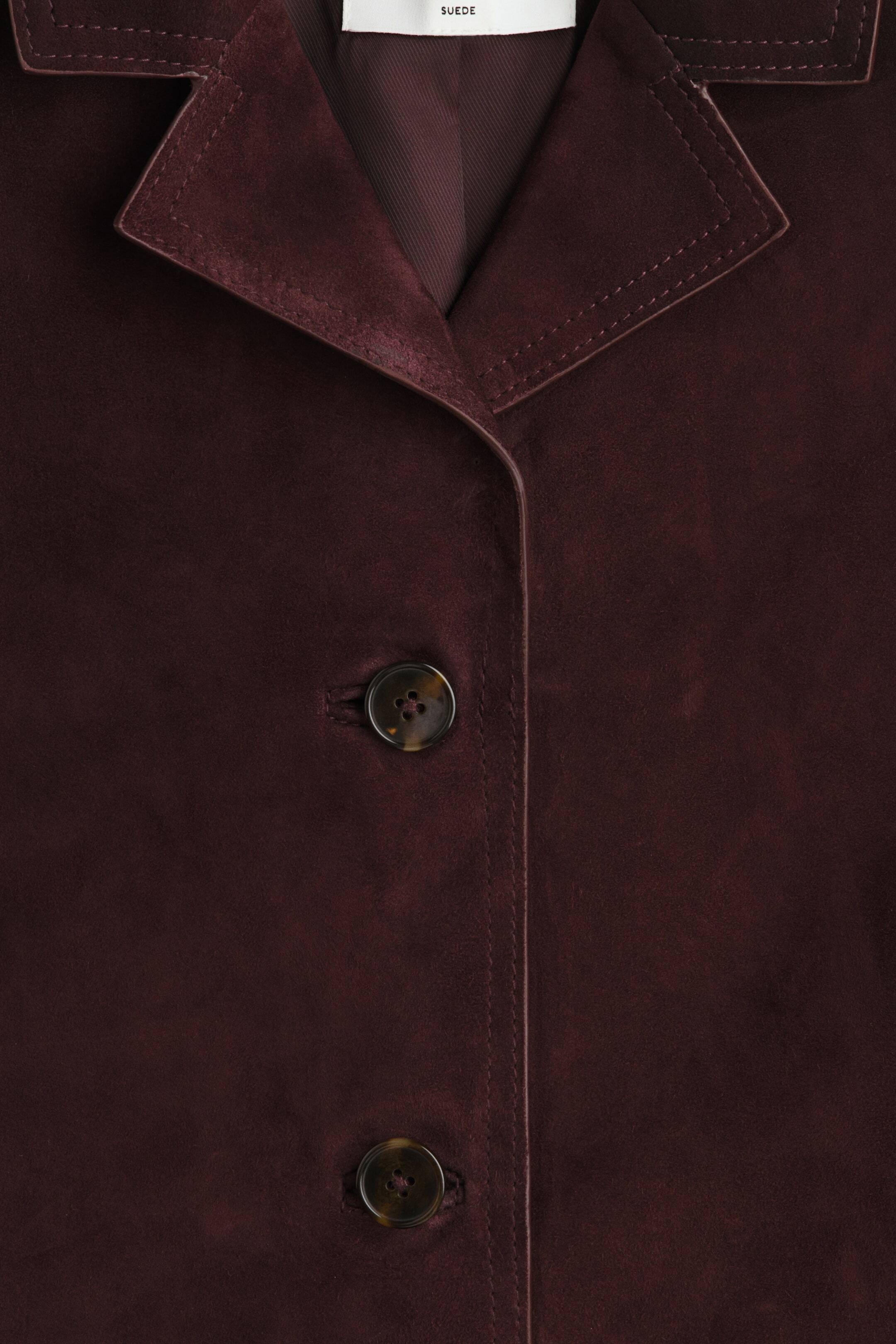 Мягкая замшевая куртка с открытым воротником, застежкой на пуговицы и открытыми передними карманами. На подкладке.
