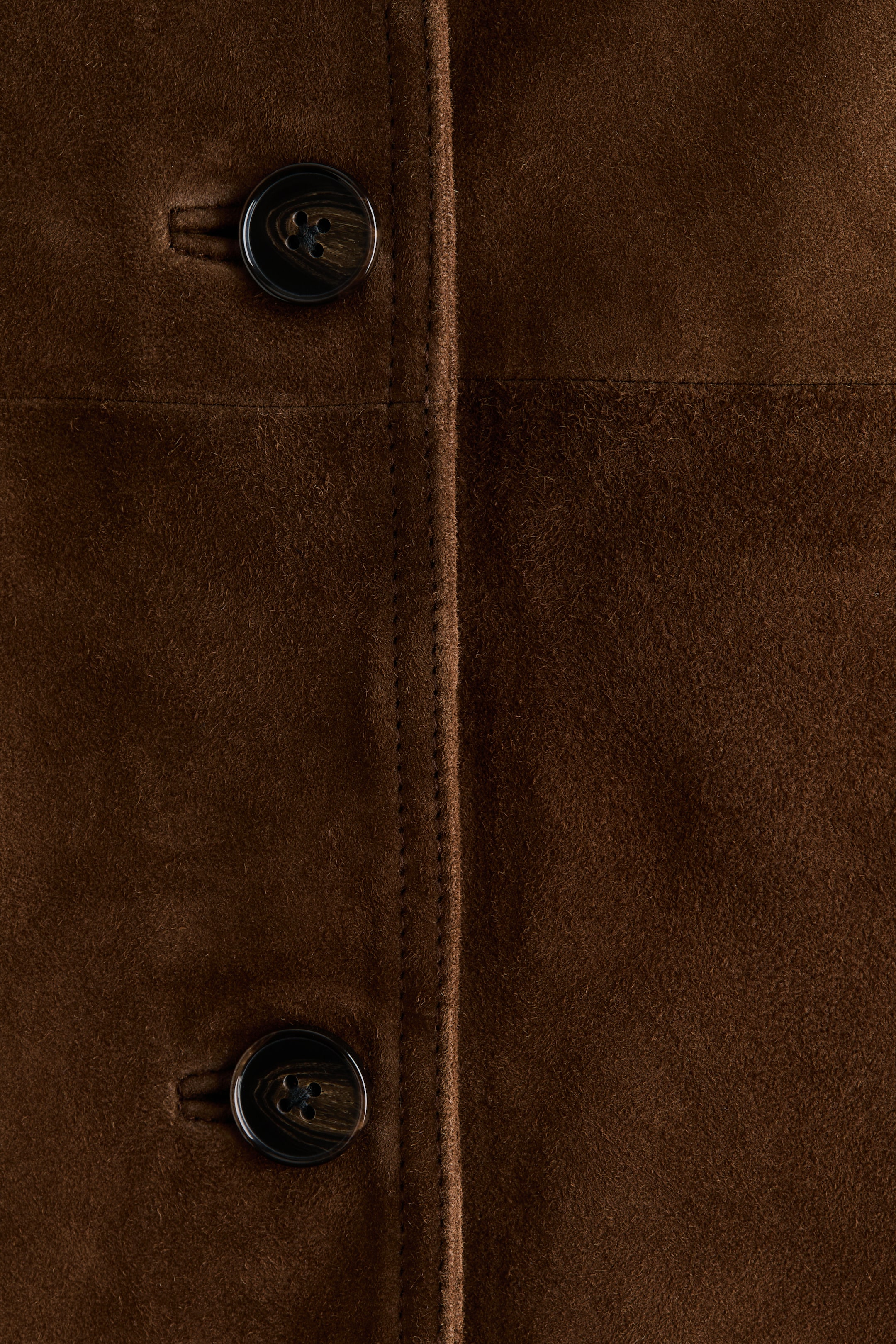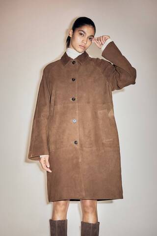 Мягкое замшевое пальто с воротником и застёжкой на пуговицы спереди. Рукава реглан, прорезные карманы по бокам и прямой подол со шлицей сзади. Длина до колена. На подкладке.