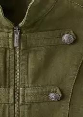 Хлопчатобумажная ткань в стиле джинсовой ткани. Приталенный крой. Воротник-стойка. Длинные рукава. Декоративные пуговицы.