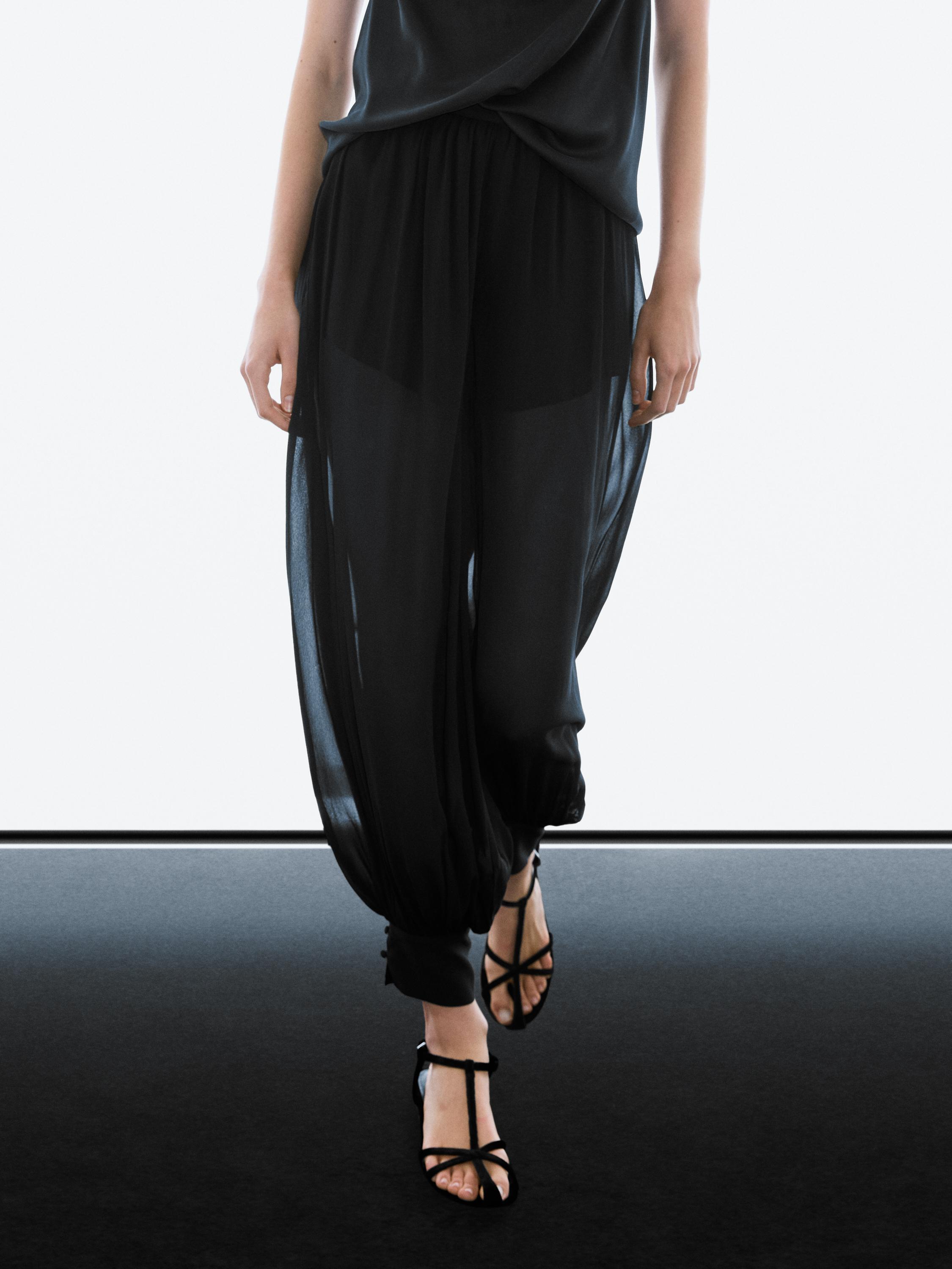Брюки-саруэль: свободный силуэт, широкие штанины и посадка по щиколотку. Подкладка из той же ткани. Эластичная талия сзади. Низ с буфами и пуговицами. Струящаяся, полупрозрачная ткань.