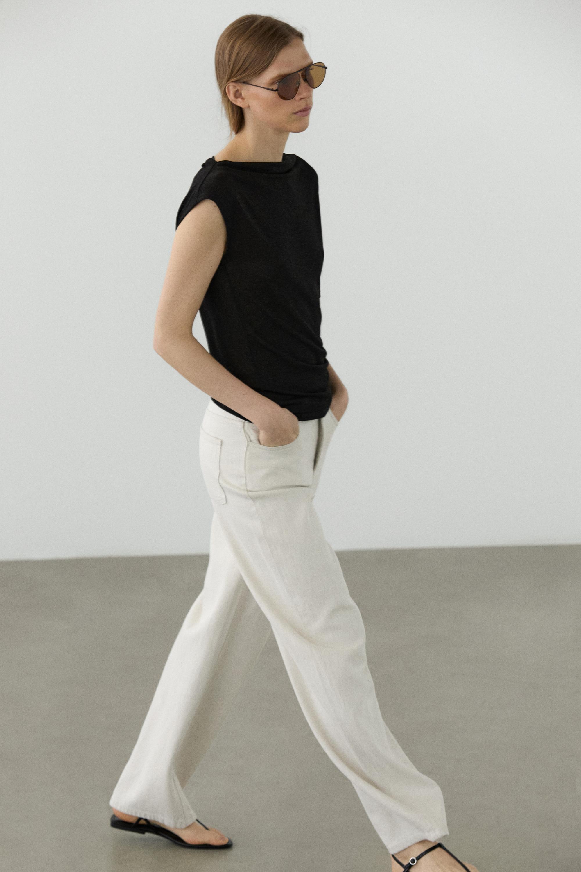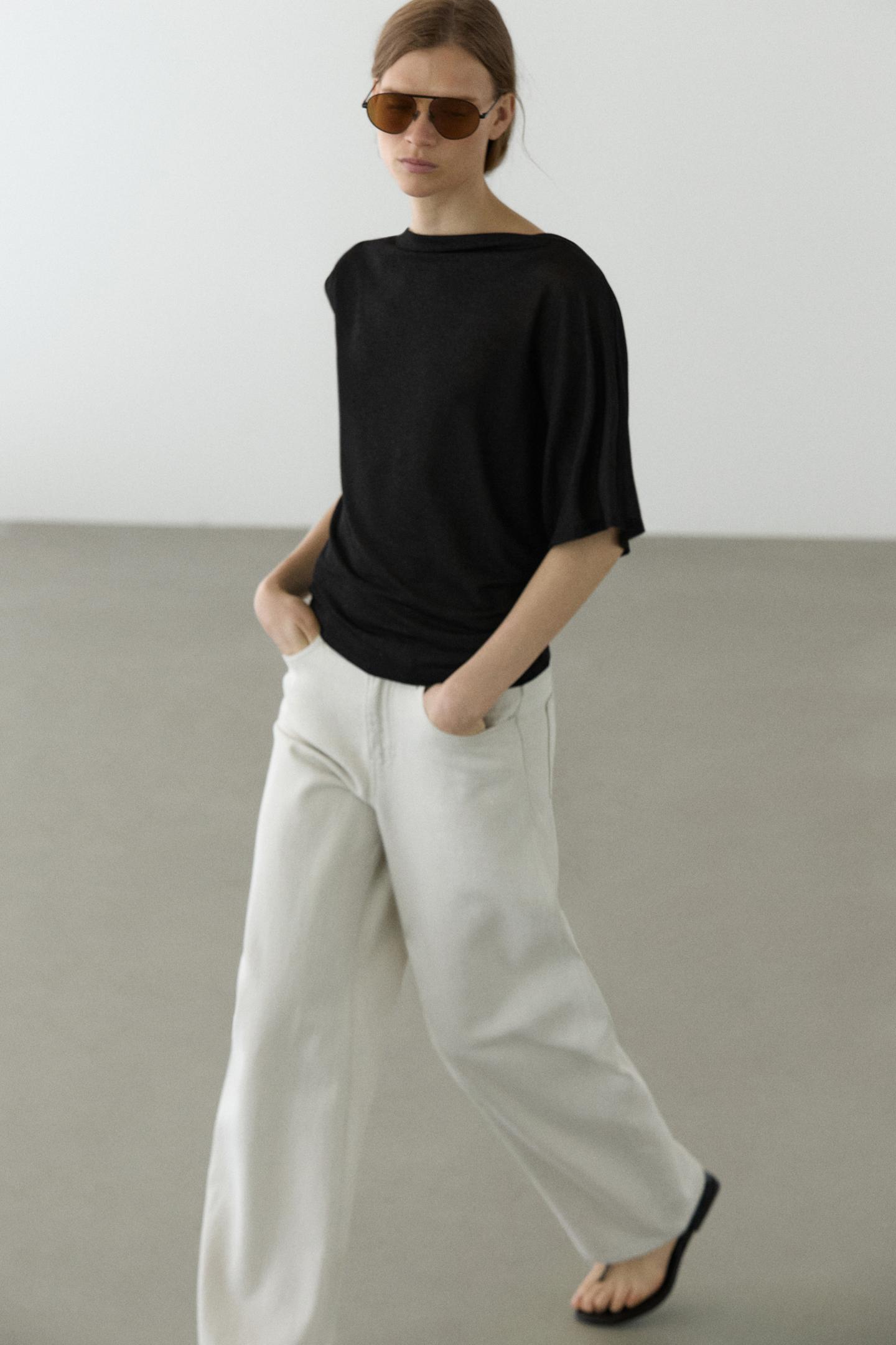 Тонкая, струящаяся футболка из ткани. Круглый вырез. Слегка мерцающая отделка из пряжи. Асимметричные рукава.