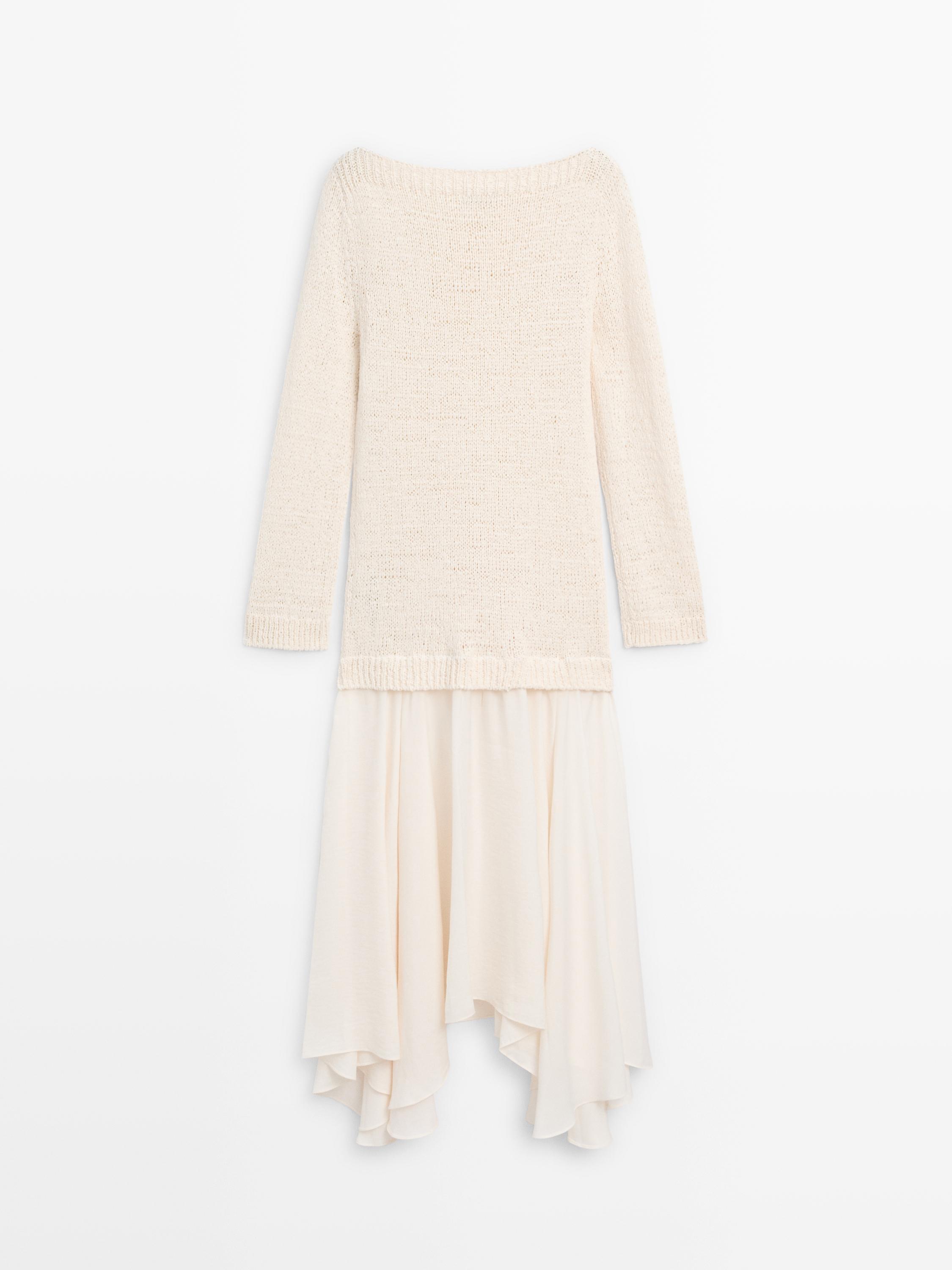 Платье миди с вязаным верхом и юбкой с оборками. Вырез-лодочка. Длинные рукава. Асимметричная отделка.