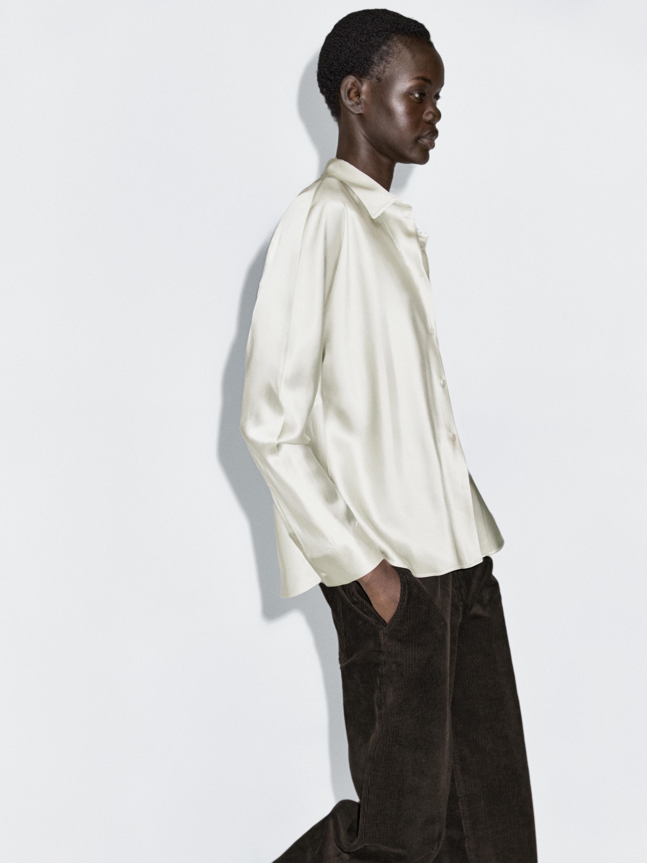 Струящаяся атласная рубашка . Рубашечный воротник. Рукава «летучая мышь». Манжеты с пуговицами. Застежка на пуговицы спереди. Разрезы по бокам снизу.