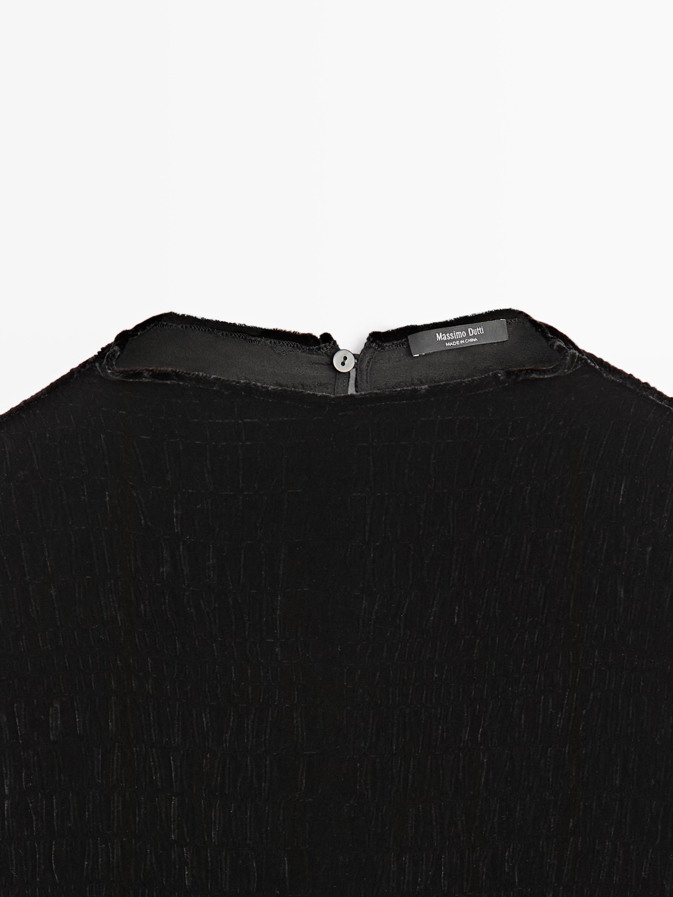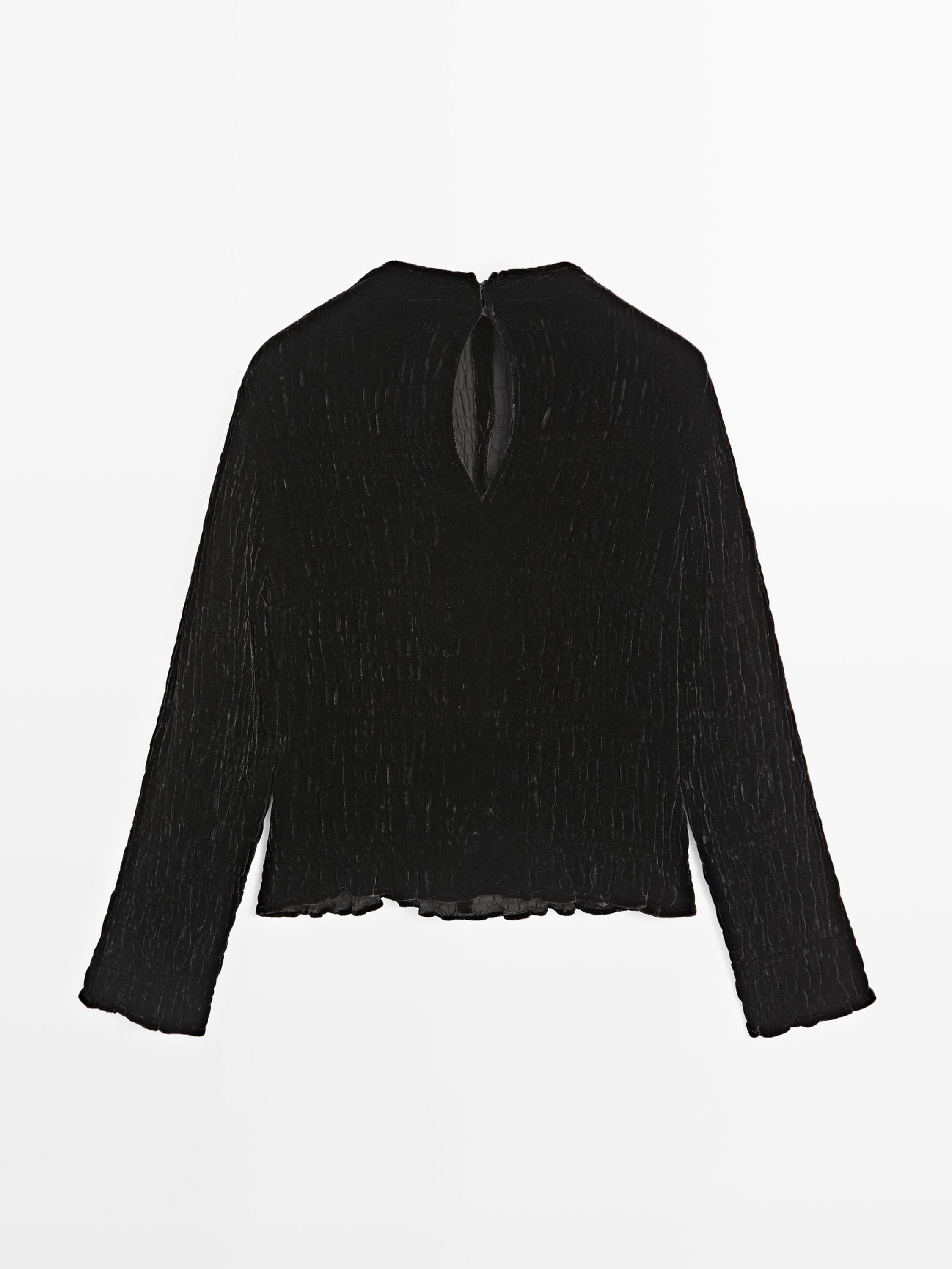 Бархатный топ. Длинные рукава. Застежка на пуговицы сзади и вырез горловины в форме капли. Высокий воротник. Сборки.