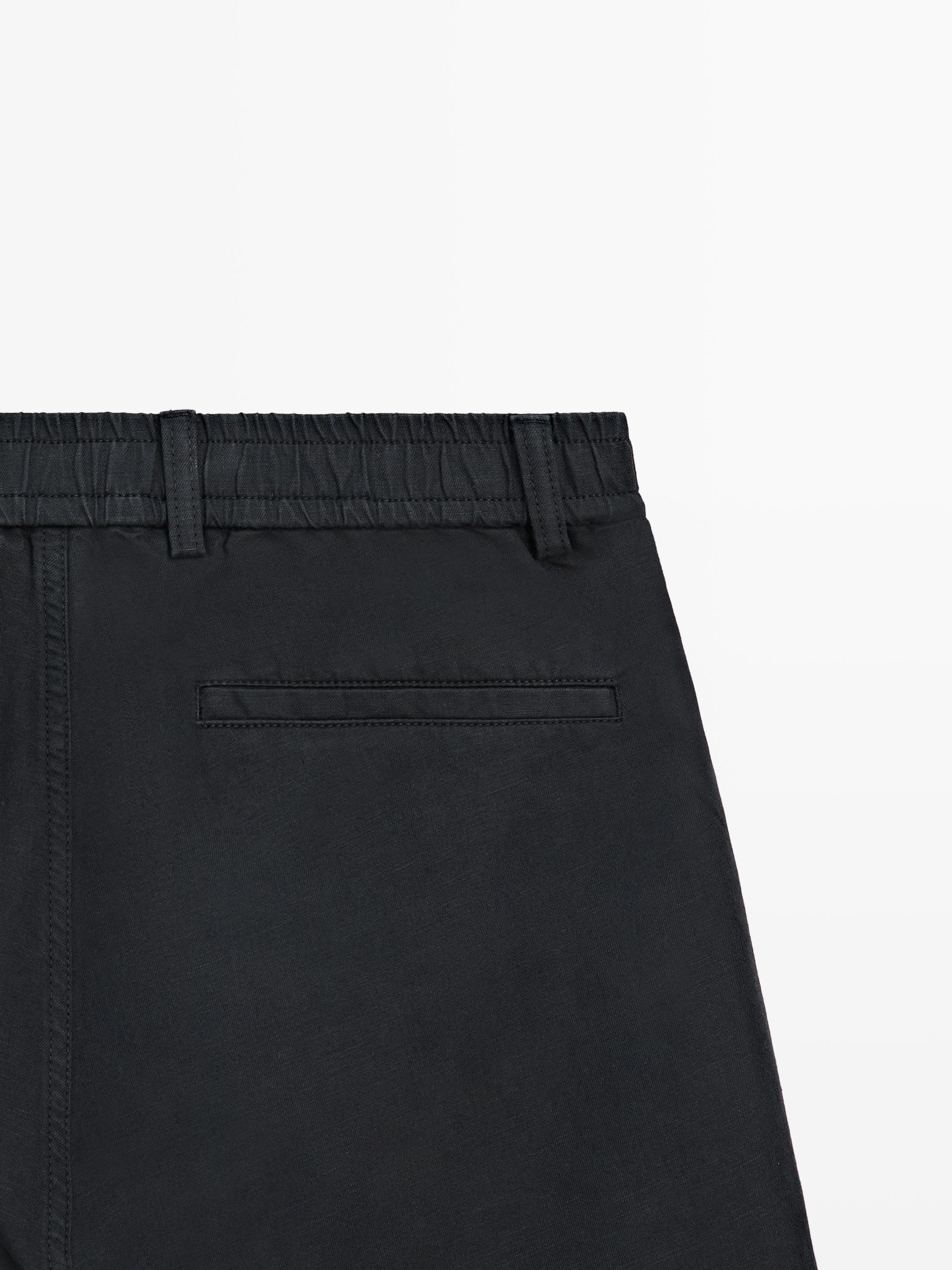 Короткие бермуды из смесовой льняной ткани. Детали в виде петель для ремня. Застежка на молнию спереди и пуговицу сверху. Два боковых кармана.