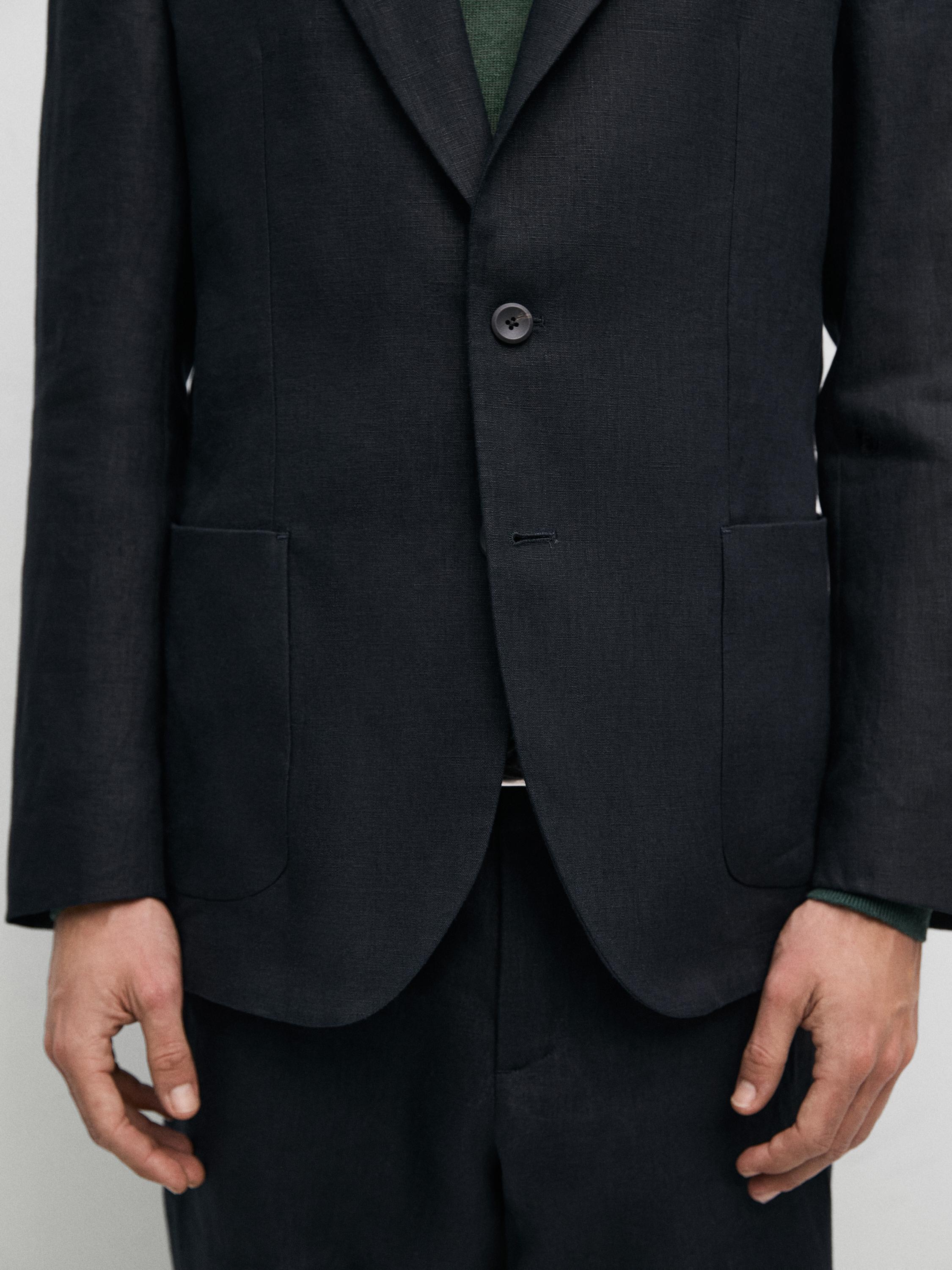 Пиджак из 100% льна. Воротник с лацканами. Длинные рукава с манжетами на пуговицах. На подкладке. Этот предмет одежды является частью костюма.