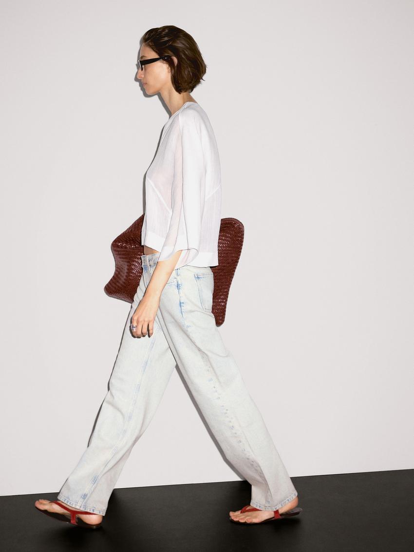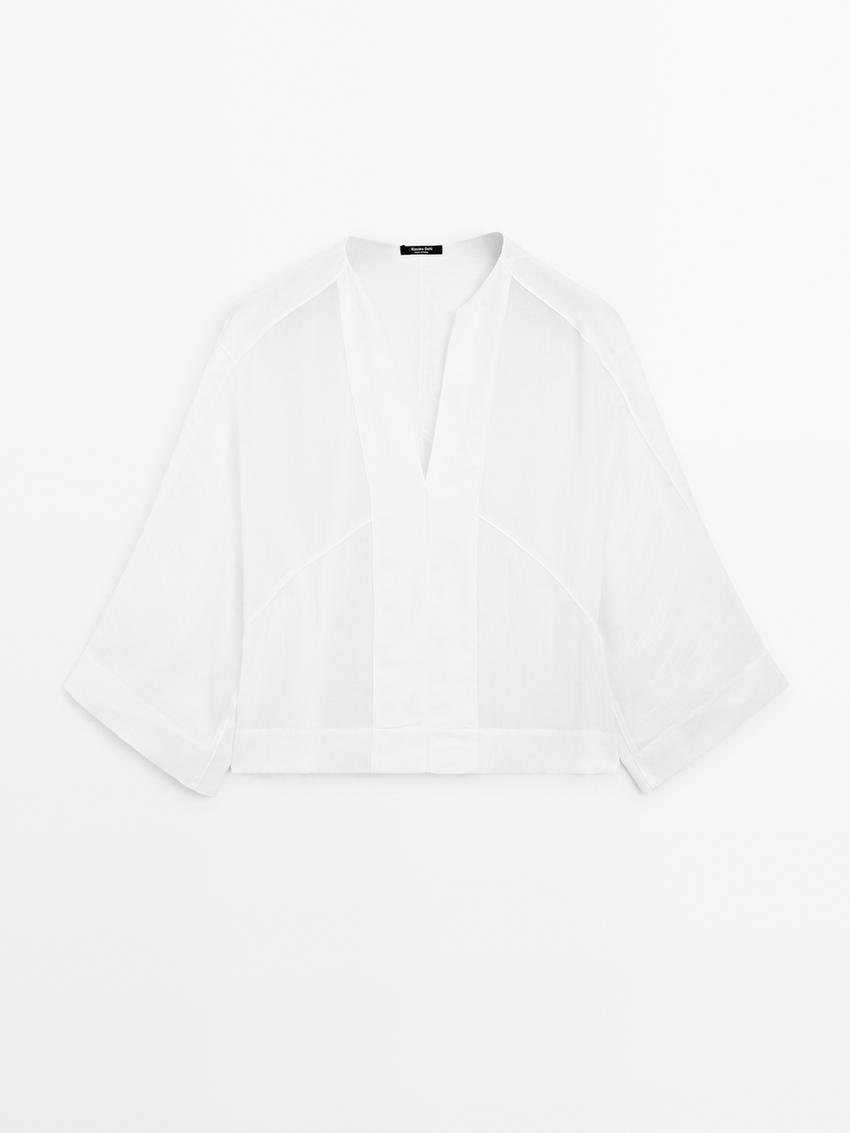 Massimo Dutti Блуза из струящегося льна с декоративными швами, натуральный, кремовый