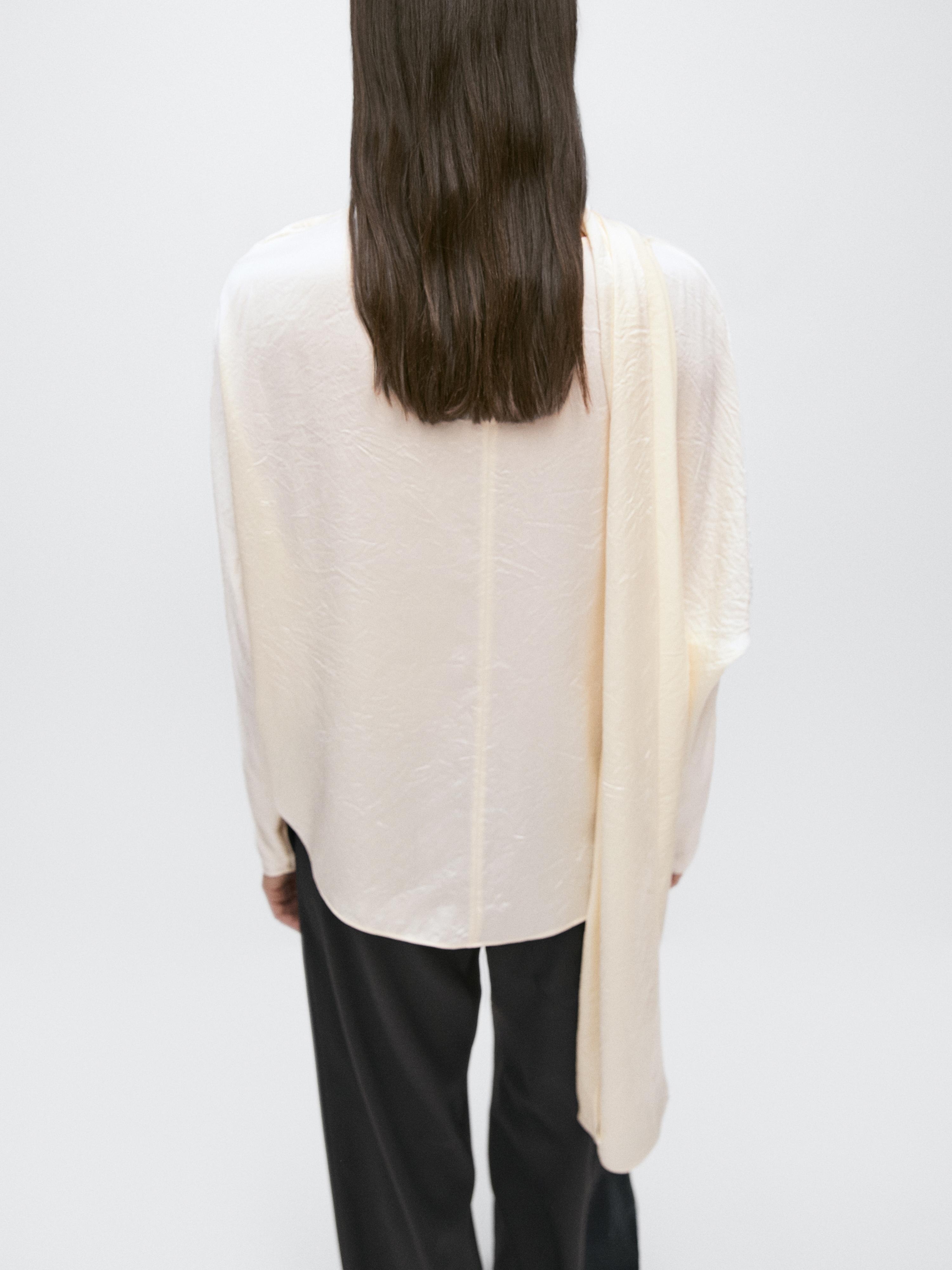 Струящаяся блузка из ткани с атласной отделкой. Свободная блузка. Круглый вырез-стойка. Длинные рукава. Застежка на пуговицы сзади и вырез в форме капли. Воротник-шаль.