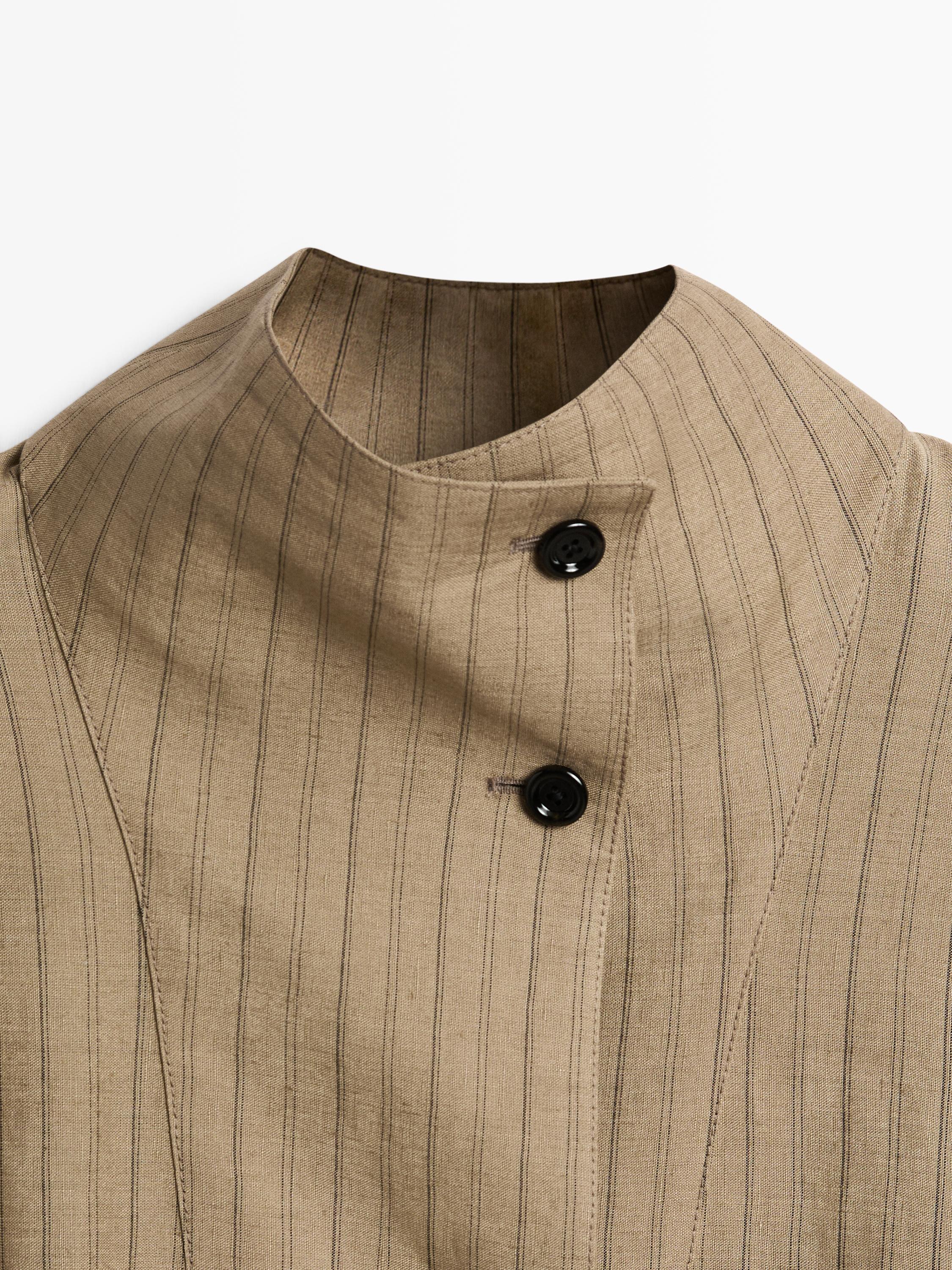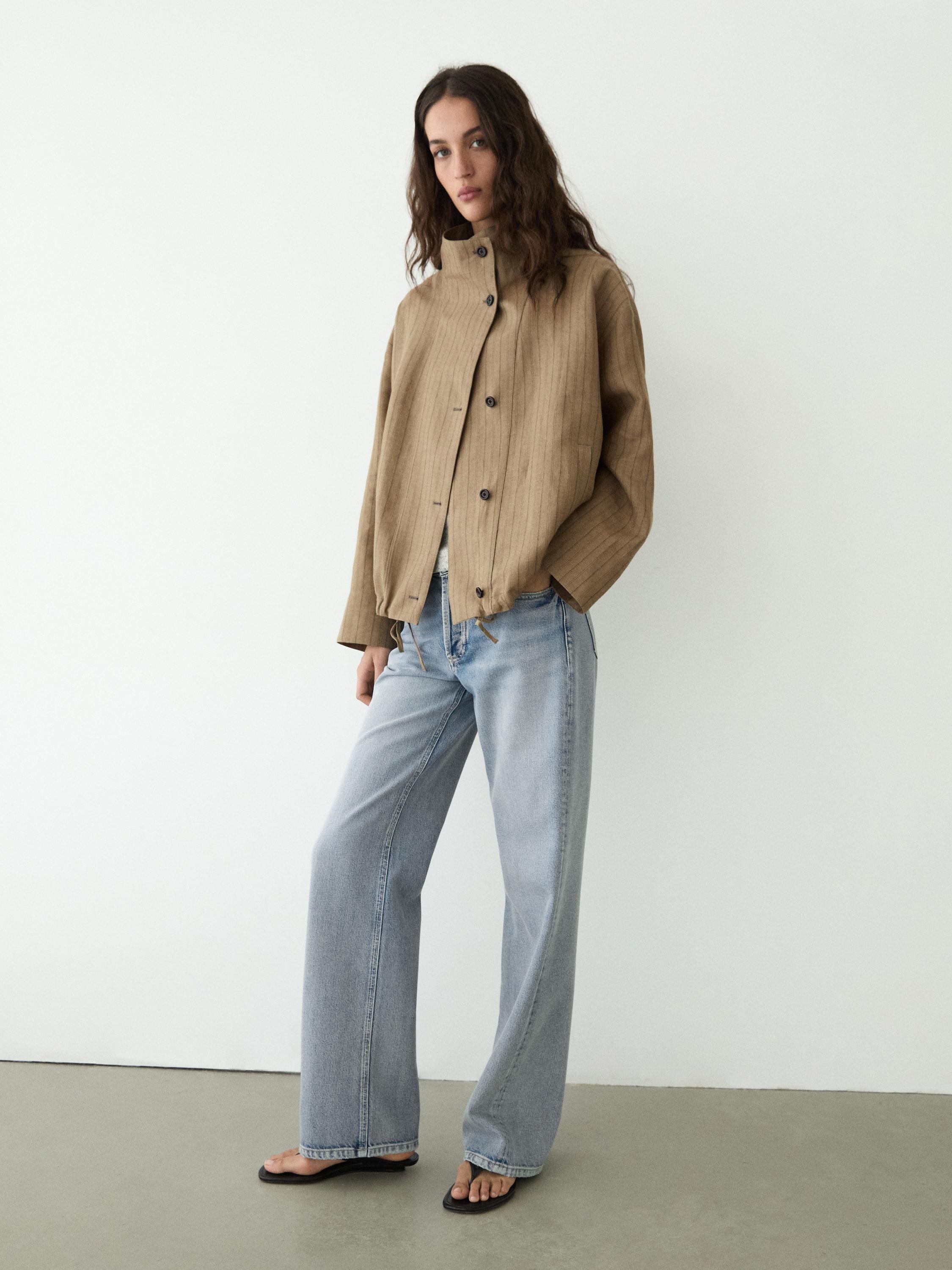 Бомбер из смесовой льняной ткани. Длинные рукава. Застежка на пуговицы спереди. Воротник-стойка на пуговицах. Два боковых кармана. Регулируемый низ на шнурке. В полоску. Тонкая, легкая ткань.