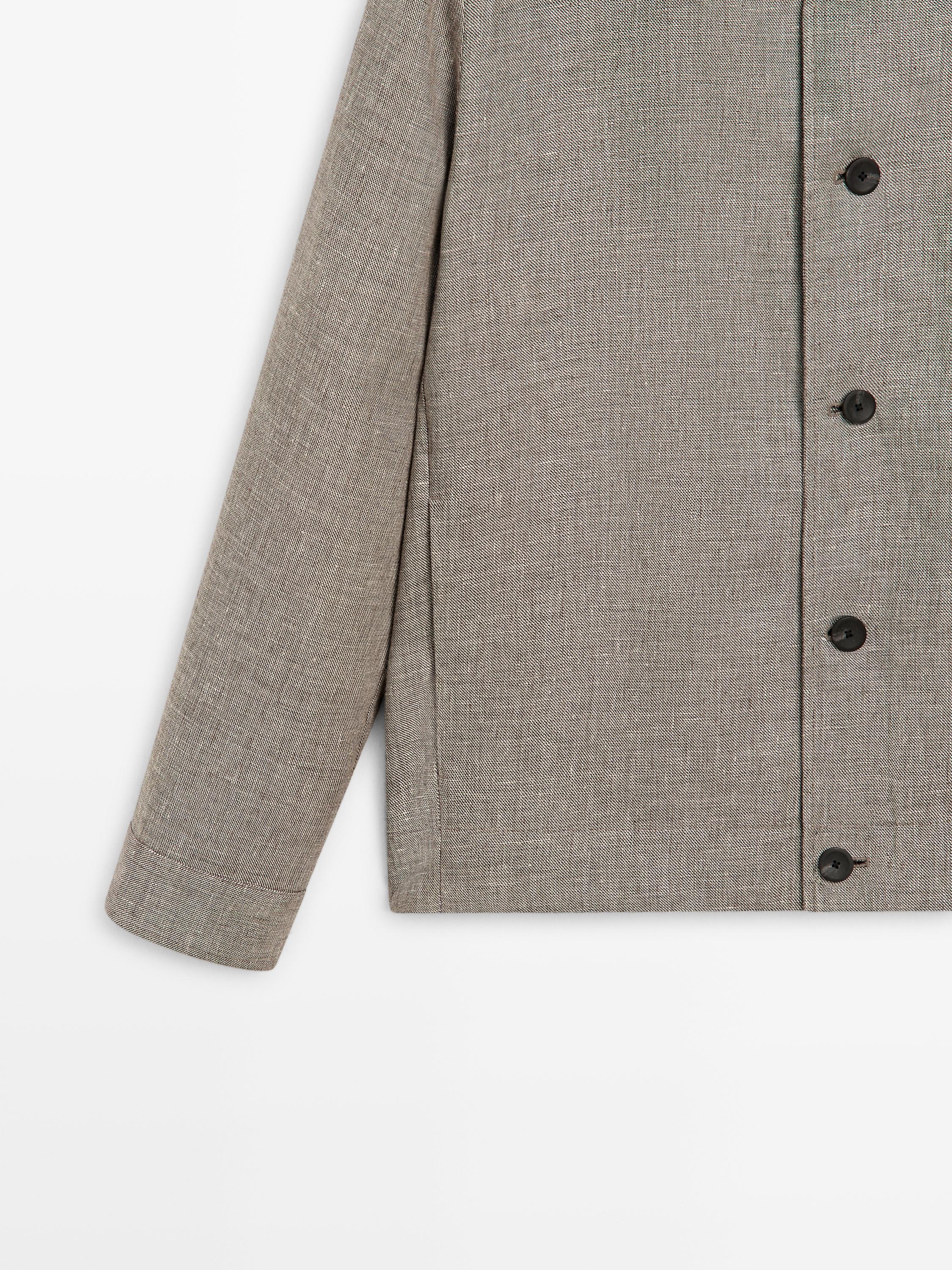 Куртка-рубашка из смесового льна. Длинные рукава и манжеты на пуговицах. Застежка на пуговицы спереди. Высокий воротник. Два боковых кармана. С подкладкой.