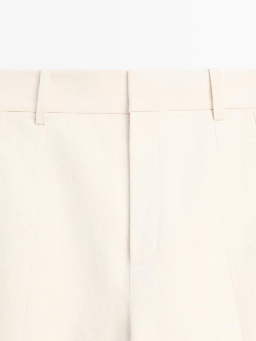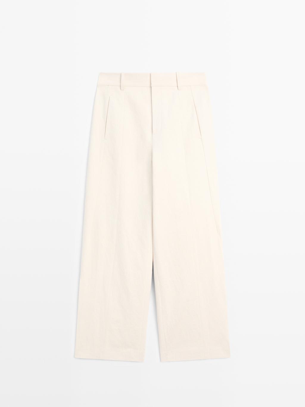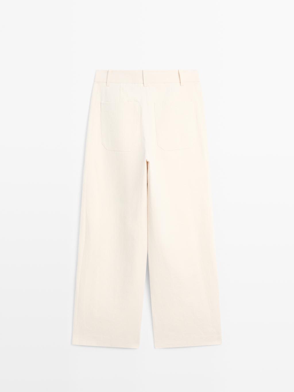 Брюки прямого кроя: этот крой отличается более широкой формой в бедрах и более узкими штанинами к щиколотке, представляя собой промежуточный вариант между узким и стандартным кроем. Брюки изготовлены из смесовой хлопчатобумажной ткани. Пояс с петлями для ремня. Застежка-молния, скрытая планкой, внутренняя пуговица. Два боковых кармана. Два накладных кармана сзади. Детализация центрального шва.