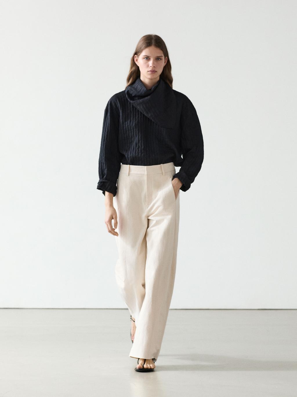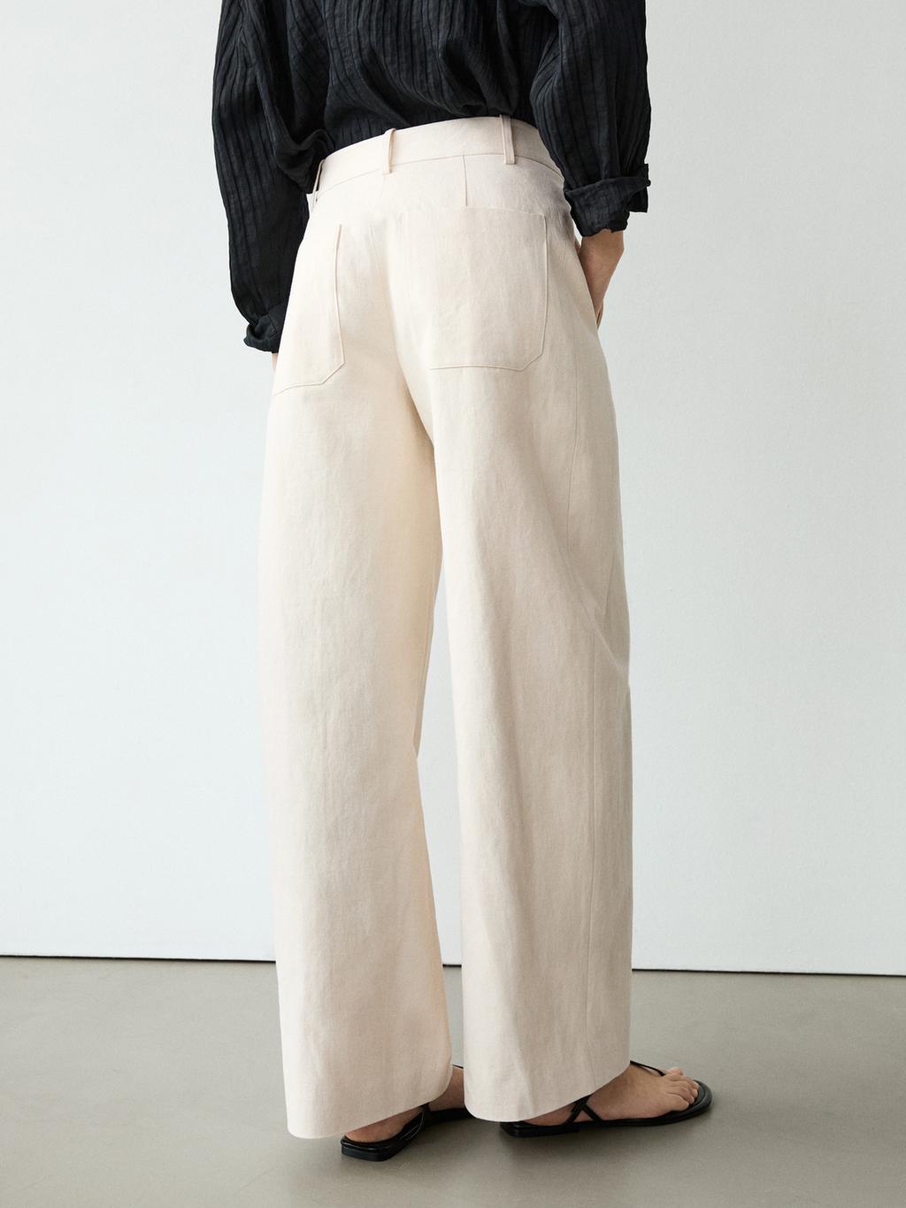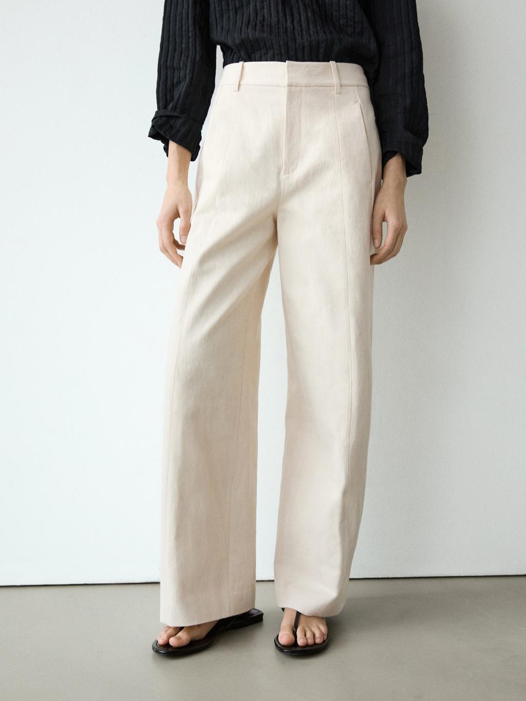 Брюки прямого кроя: этот крой отличается более широкой формой в бедрах и более узкими штанинами к щиколотке, представляя собой промежуточный вариант между узким и стандартным кроем. Брюки изготовлены из смесовой хлопчатобумажной ткани. Пояс с петлями для ремня. Застежка-молния, скрытая планкой, внутренняя пуговица. Два боковых кармана. Два накладных кармана сзади. Детализация центрального шва.