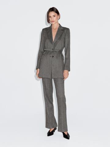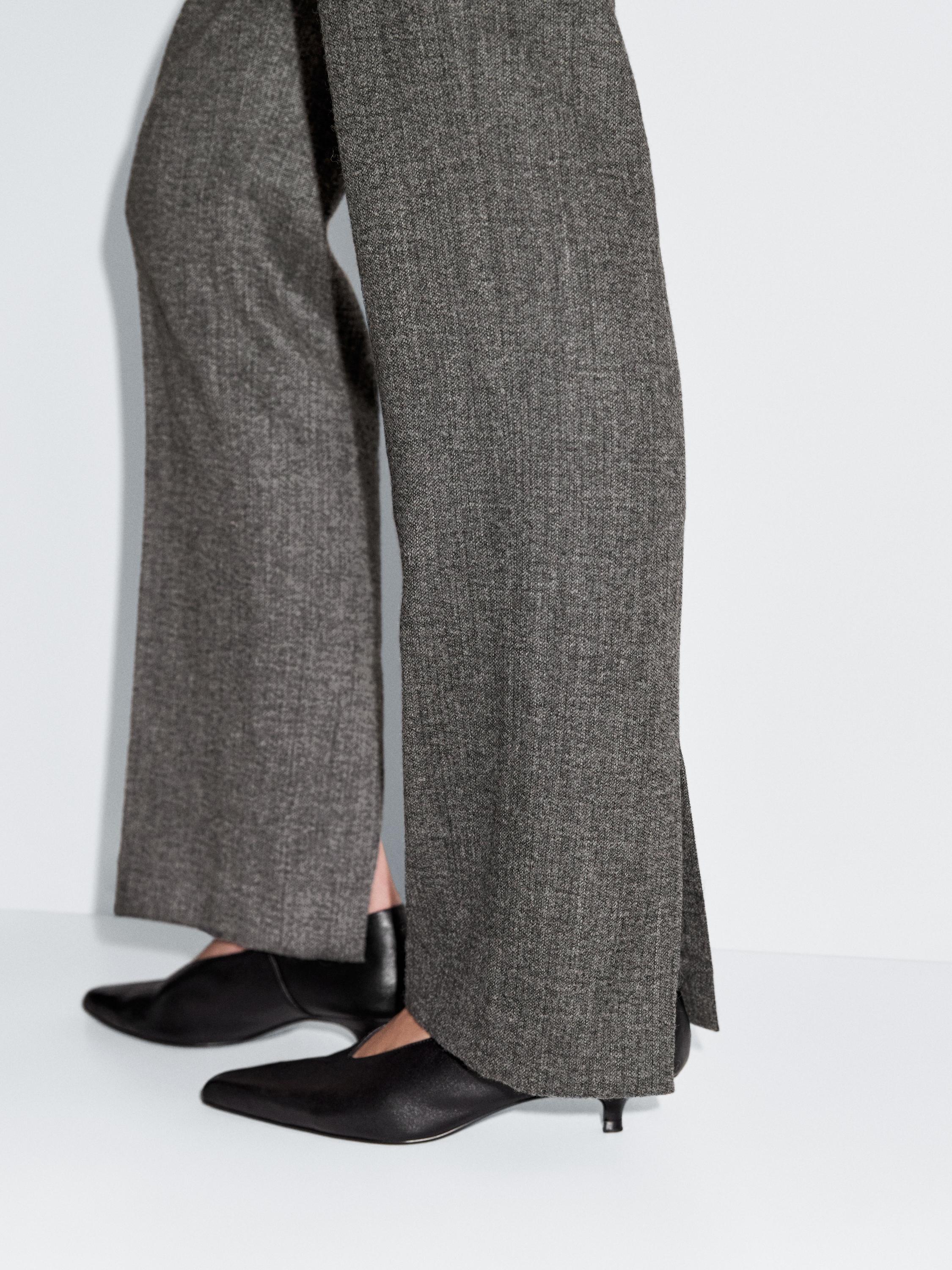 Костюмные брюки из смесовой шерстяной ткани. Слегка приталенный силуэт, создающий более четкий и стройный вид. Застёжка на молнию, скрытую под планкой, с застёжкой на крючок и пуговицу. Два прорезных кармана сзади. Низ с шлицами спереди. Отделка с эффектом крапа. Этот предмет одежды входит в комплект костюма.