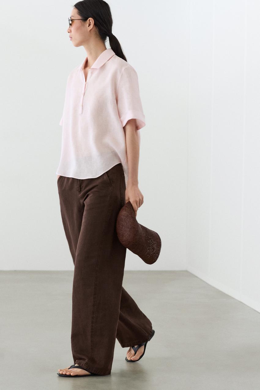 Брюки из смесовой льняной ткани. Пояс с петлями для ремня. Застежка на молнию и пуговицу спереди. Два боковых кармана. Детализация швов.
