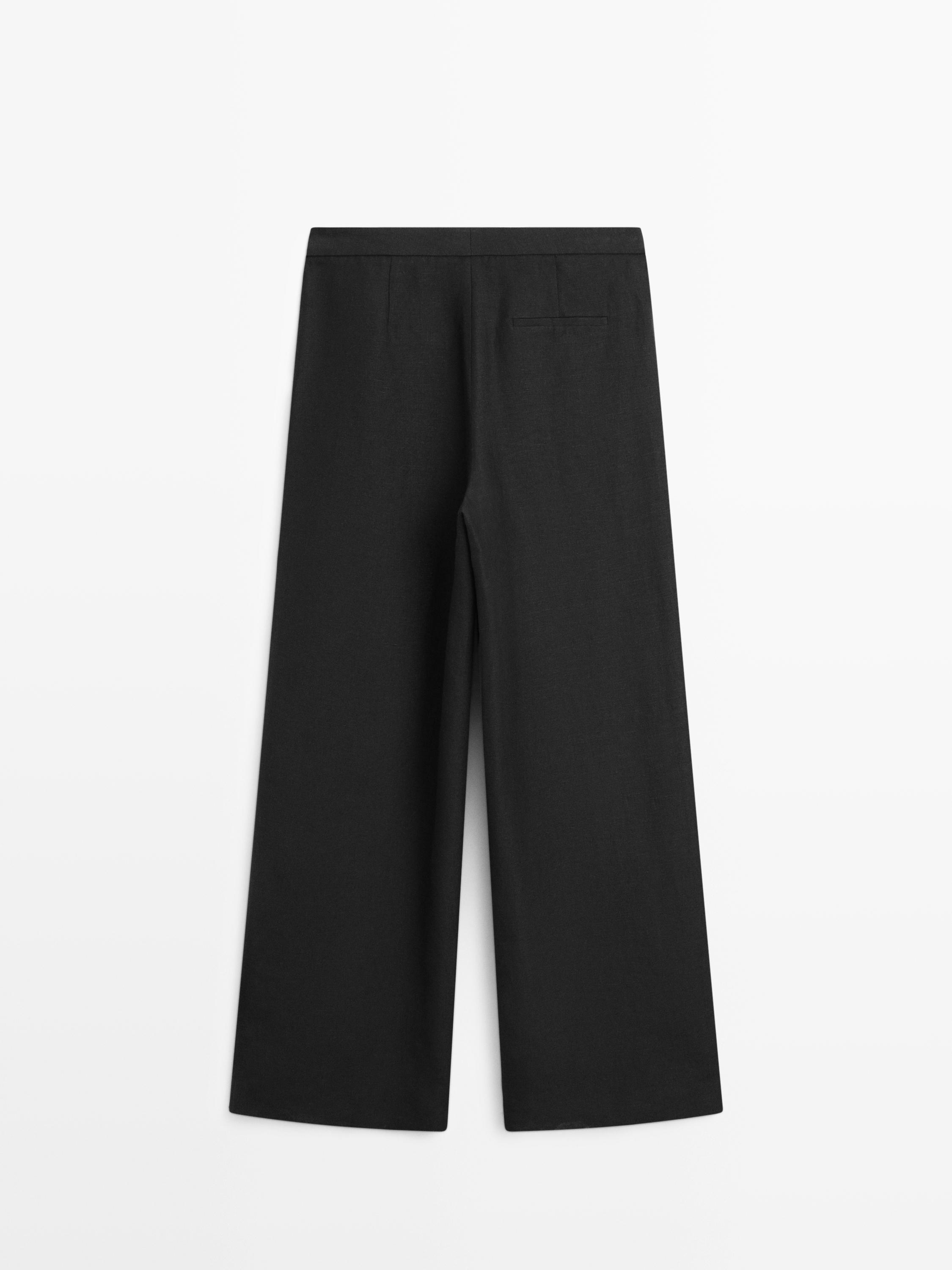 Брюки от костюма из льняной ткани. Два боковых кармана. Один прорезной карман сзади. Вытачки спереди. Эта вещь является частью костюма. Застежка на молнию и потайную пуговицу.