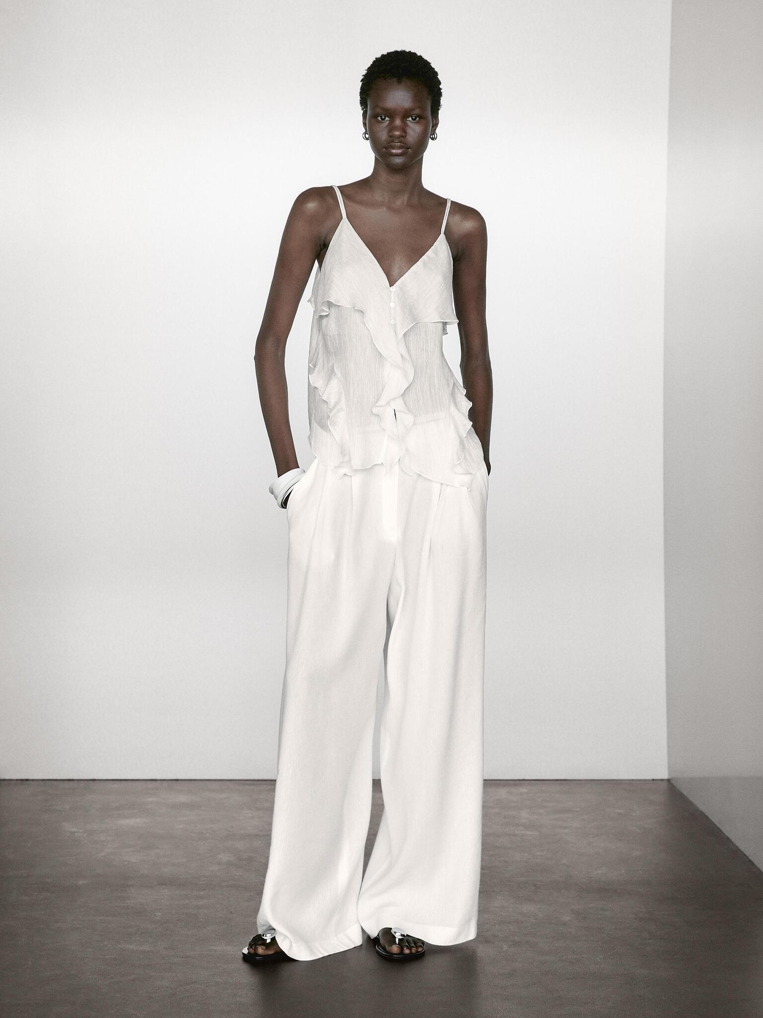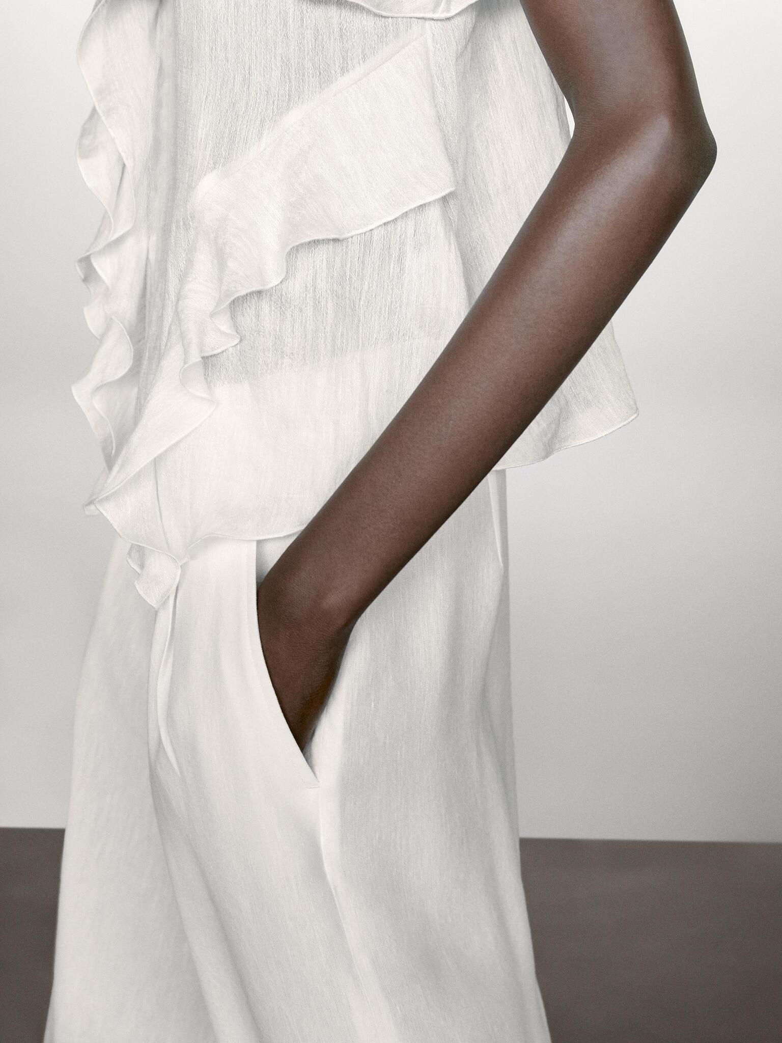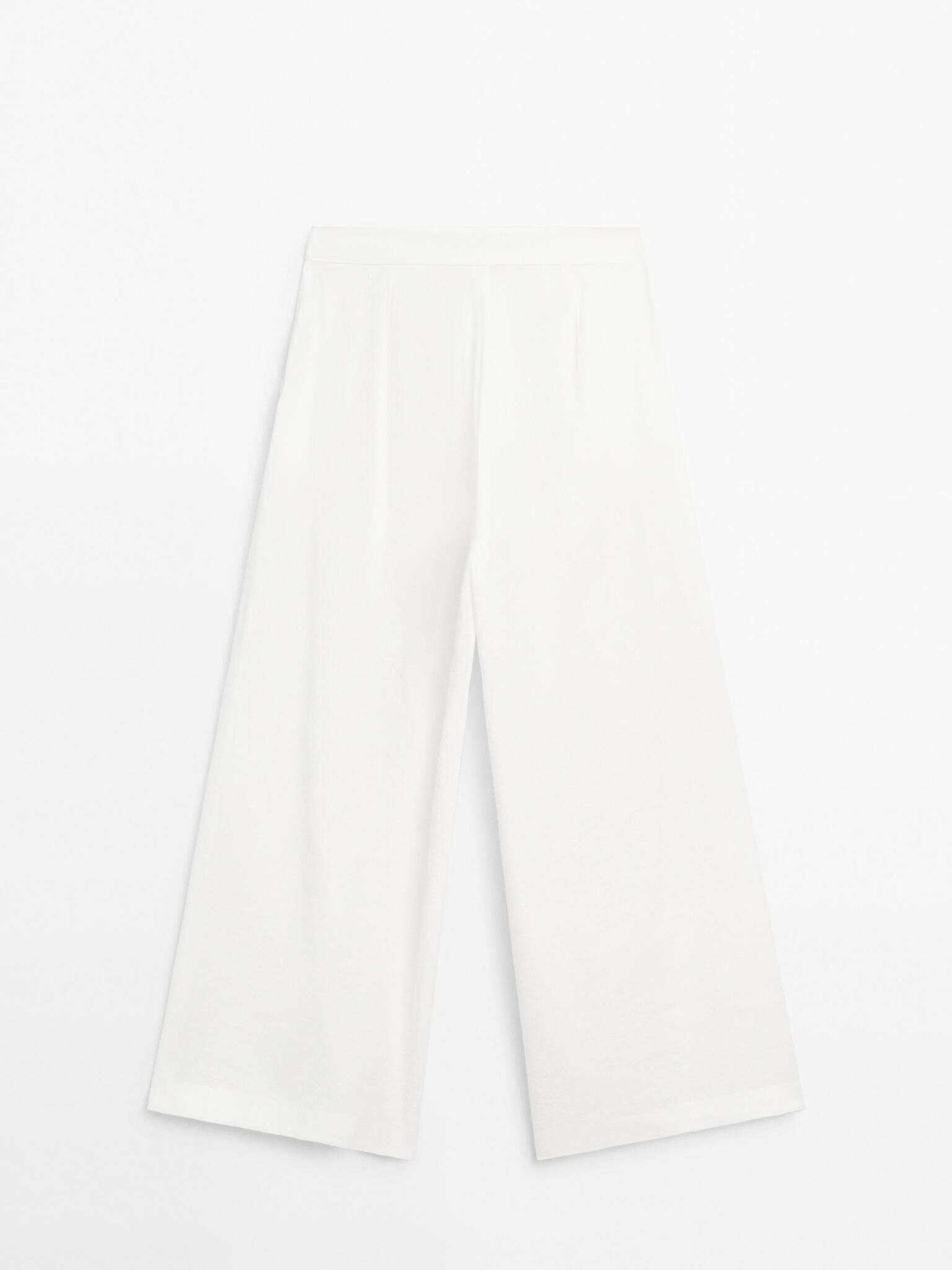 Брюки палаццо: этот крой характеризуется приталенной талией и широкими штанинами от бедра до подола. Средняя талия. Потайная застежка-молния, ремешок на пуговицах, застежка на крючок и пуговицу внутри. Два боковых кармана. Два прорезных кармана сзади. Изготовлены из льняной смеси. Струящаяся ткань. Доступна подходящая модель.