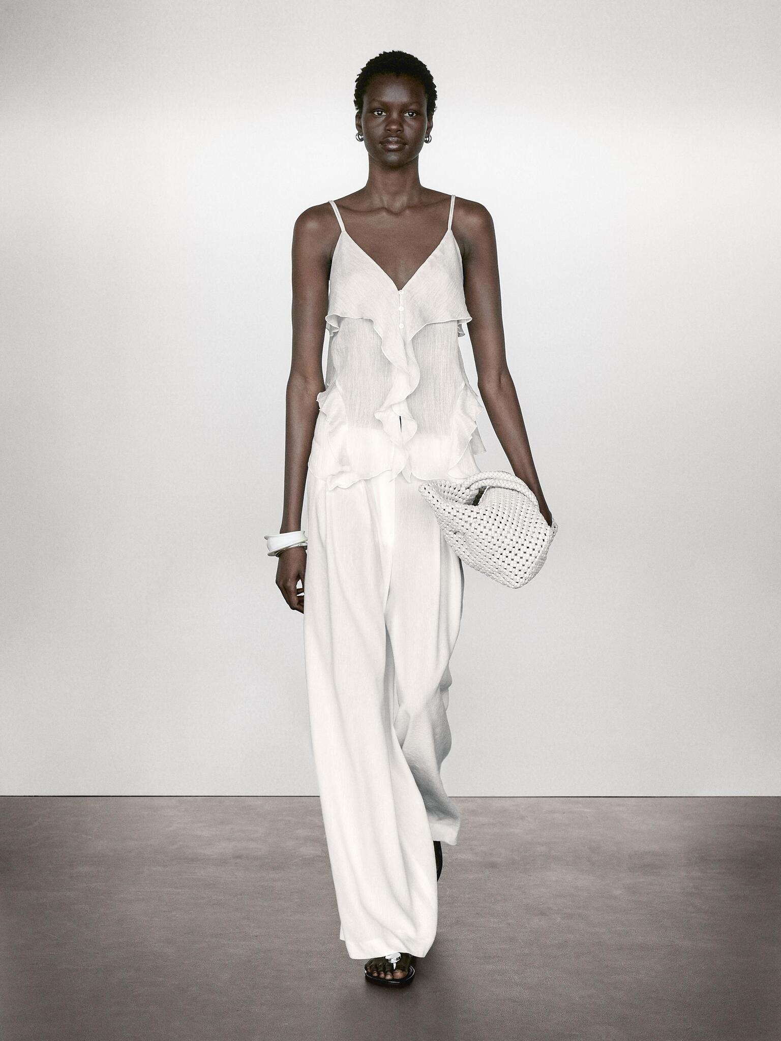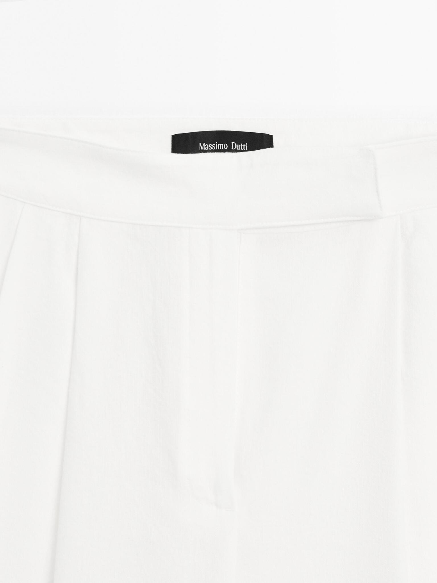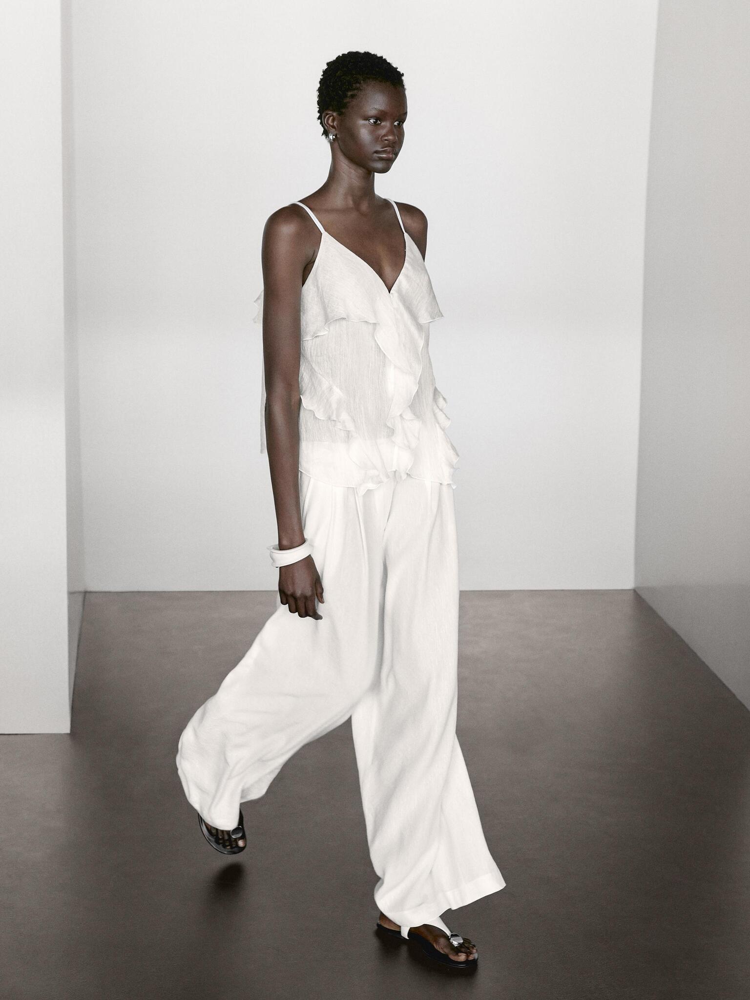 Брюки палаццо: этот крой характеризуется приталенной талией и широкими штанинами от бедра до подола. Средняя талия. Потайная застежка-молния, ремешок на пуговицах, застежка на крючок и пуговицу внутри. Два боковых кармана. Два прорезных кармана сзади. Изготовлены из льняной смеси. Струящаяся ткань. Доступна подходящая модель.