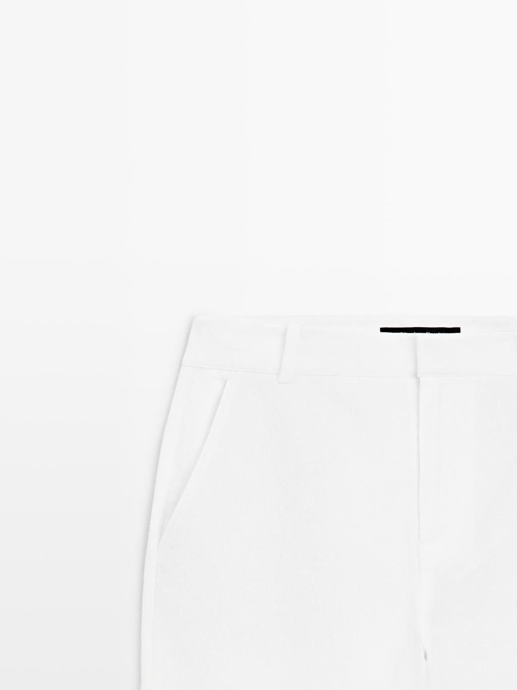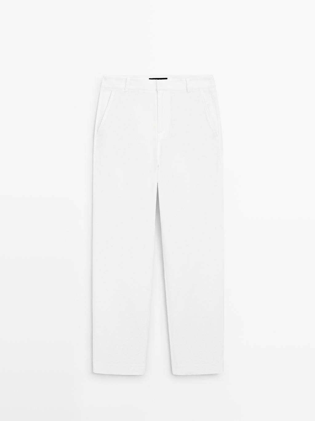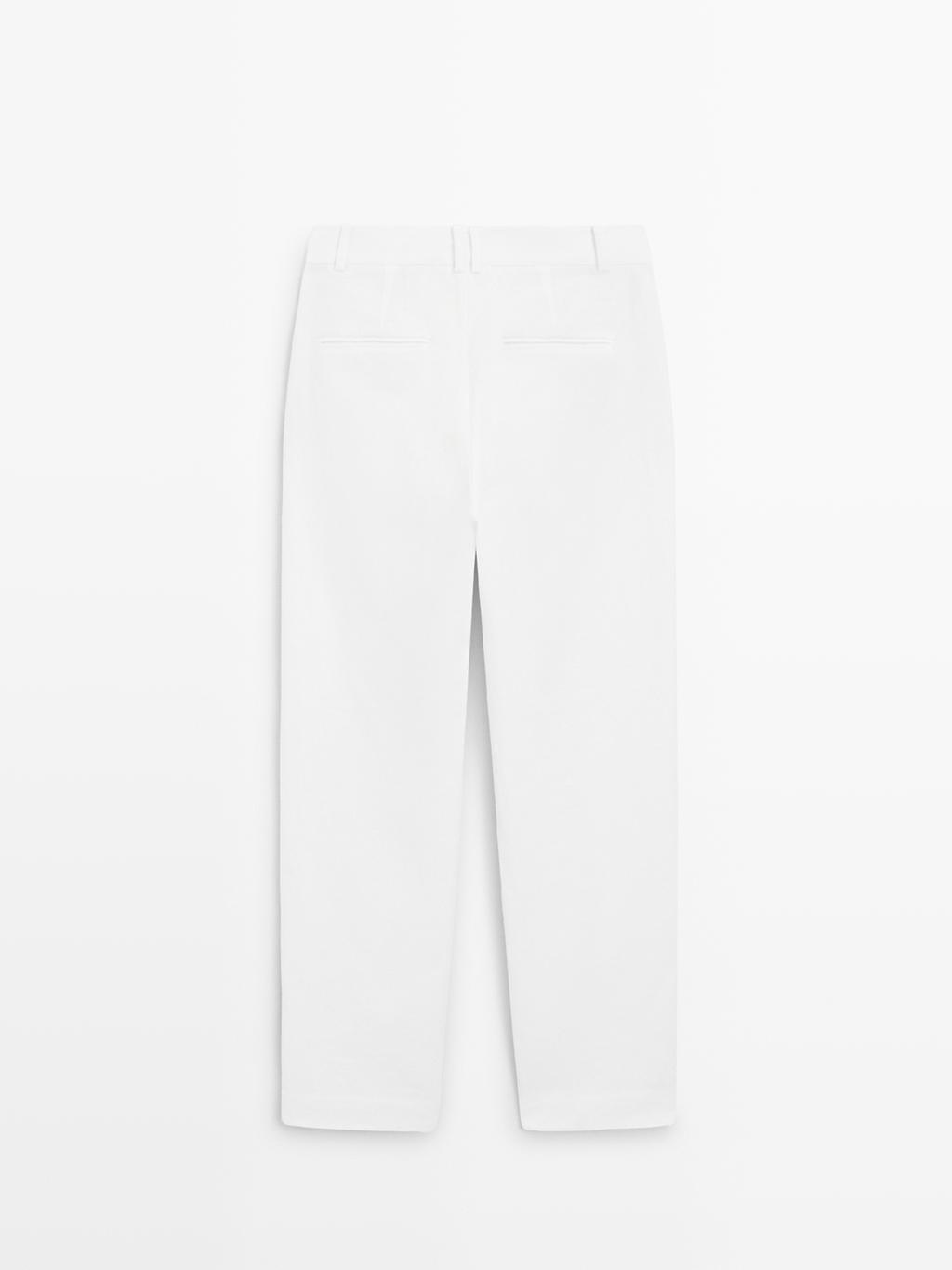 Брюки зауженного кроя: этот фасон имеет слегка приталенный силуэт, облегающий талию и штанины. Брюки изготовлены из смесовой льняной ткани. Детали в виде шлевок для ремня. Застежка-молния, скрытая планкой, кнопкой и ремешком на пуговице. Два боковых кармана. Два прорезных кармана сзади.
