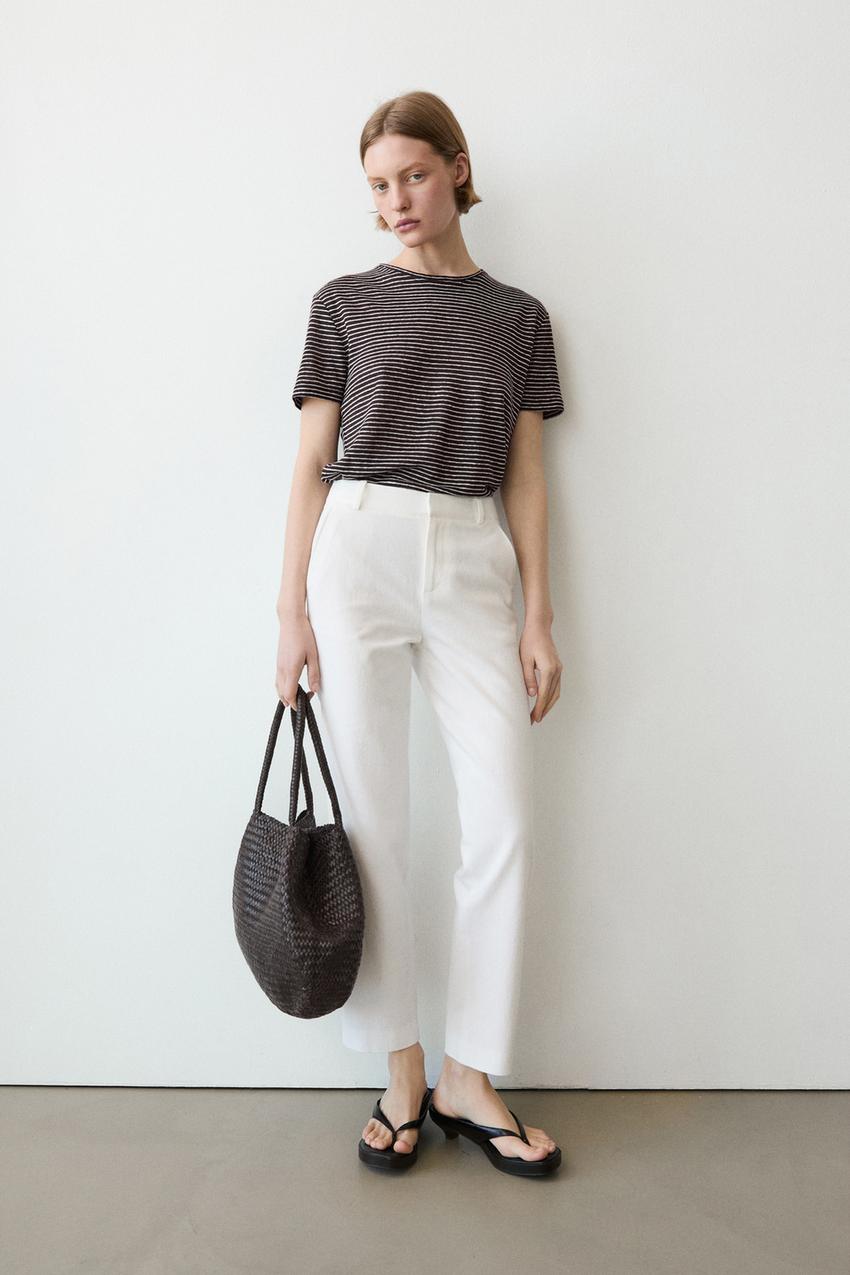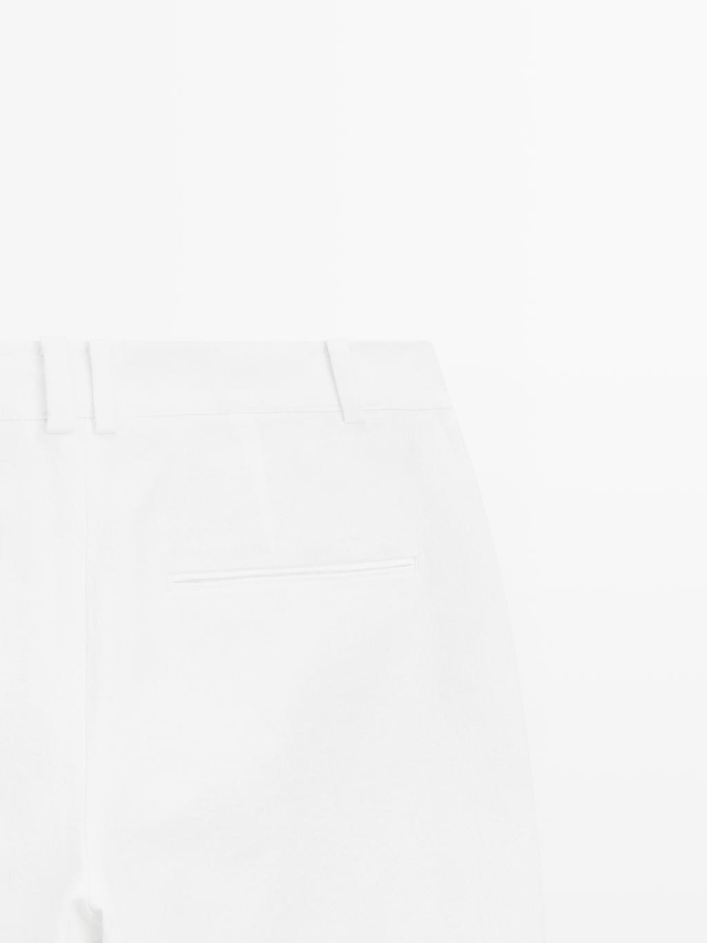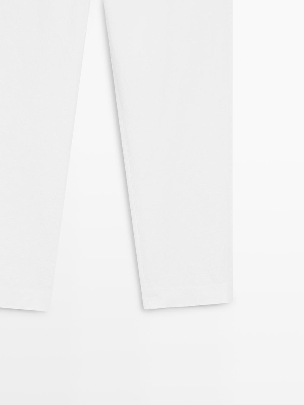 Брюки зауженного кроя: этот фасон имеет слегка приталенный силуэт, облегающий талию и штанины. Брюки изготовлены из смесовой льняной ткани. Детали в виде шлевок для ремня. Застежка-молния, скрытая планкой, кнопкой и ремешком на пуговице. Два боковых кармана. Два прорезных кармана сзади.