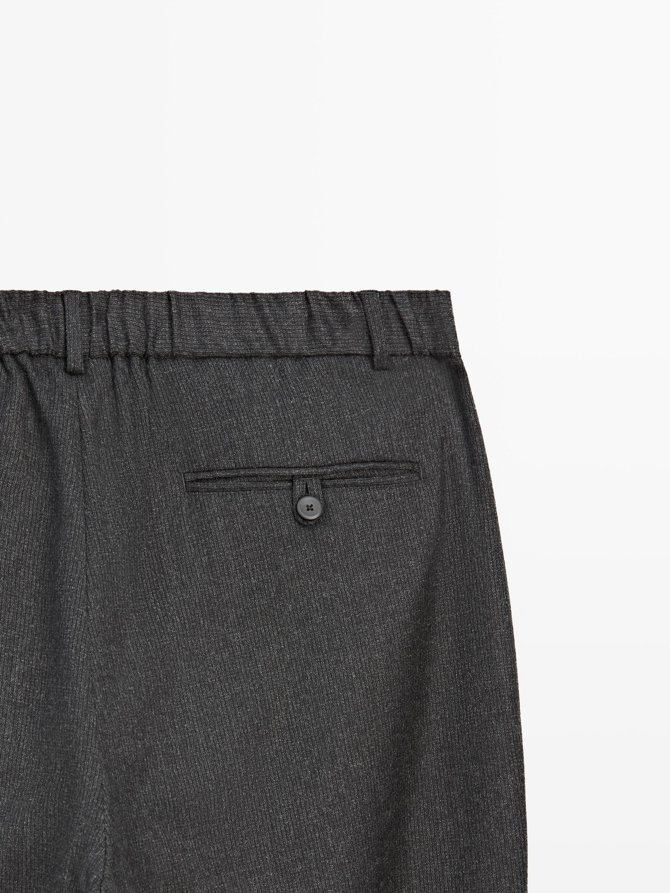 Брюки прямого кроя: прямой силуэт от талии до щиколотки, без дополнительной регулировки по длине штанин. Ткань в клетку. Эластичный пояс сзади. Два боковых кармана. Два прорезных кармана сзади. Вытачки спереди. Изготовлены из смесовой шерстяной ткани.