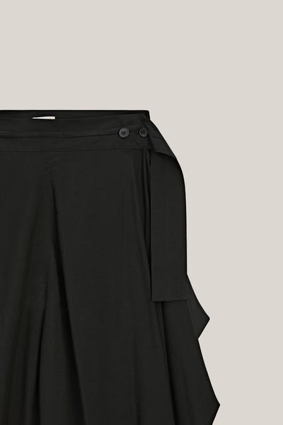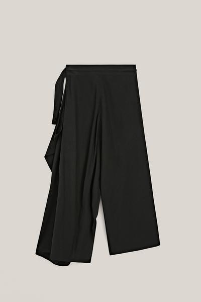 Брюки из шелковой ткани. Застежка на запах с боковой пуговицей. Разрез по низу сбоку.