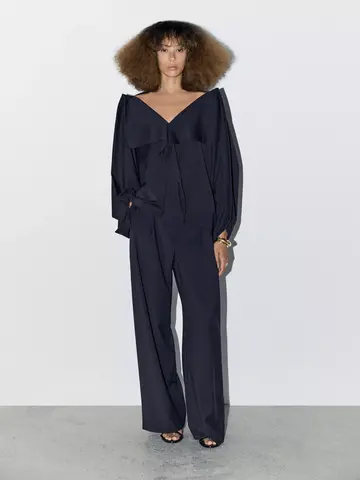 Брюки из 100% шерсти. Два боковых кармана. Два прорезных кармана сзади. Двойная вытачка спереди. Свободный и свободный силуэт, не приталенный.
