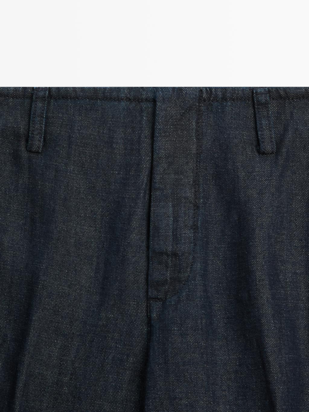 Джинсовые брюки. Пояс с петлями для ремня. Изготовлены из хлопчатобумажной льняной ткани. Скрытая застежка на молнию и крючок. Два боковых кармана. Два прорезных кармана сзади.