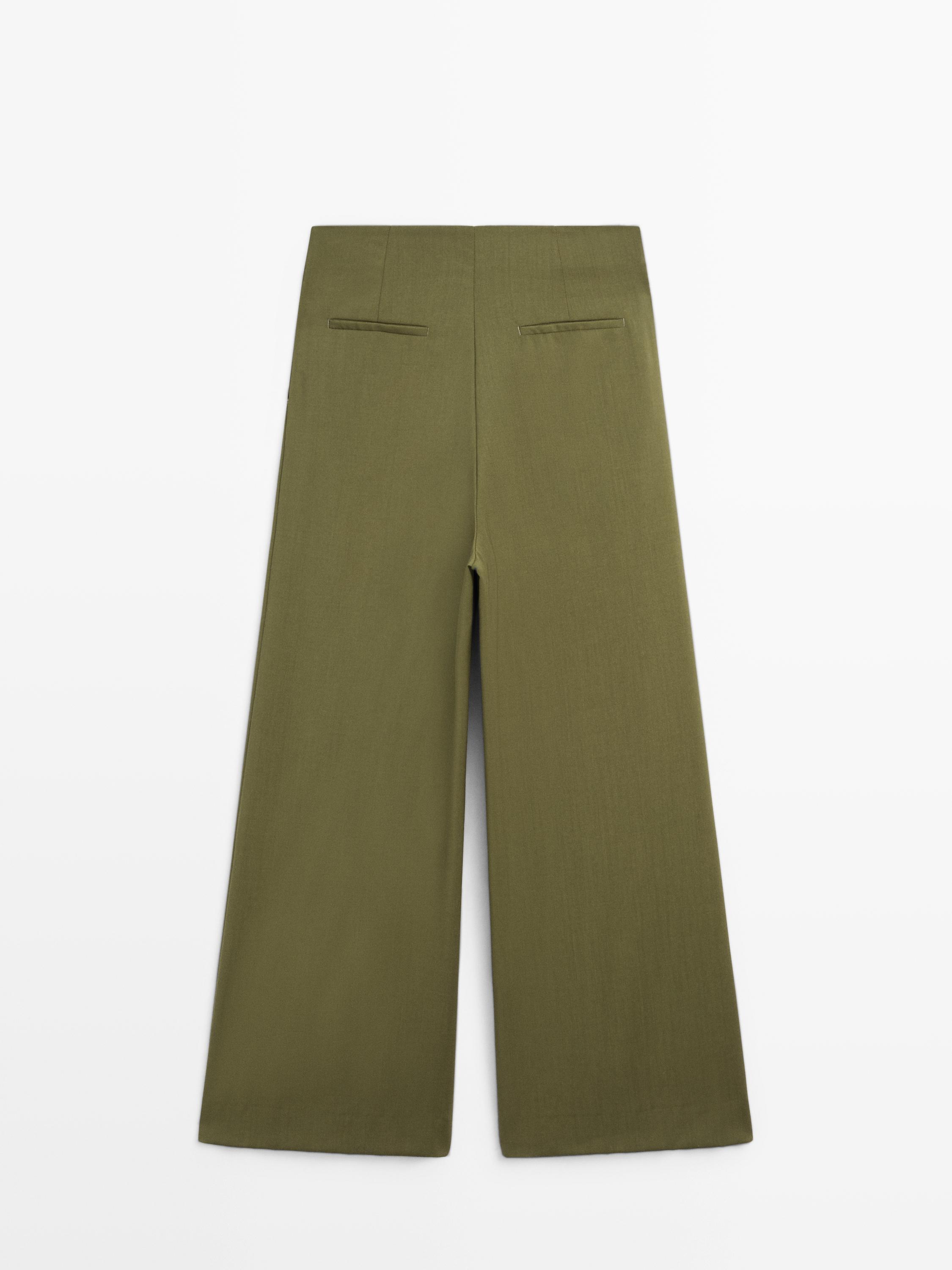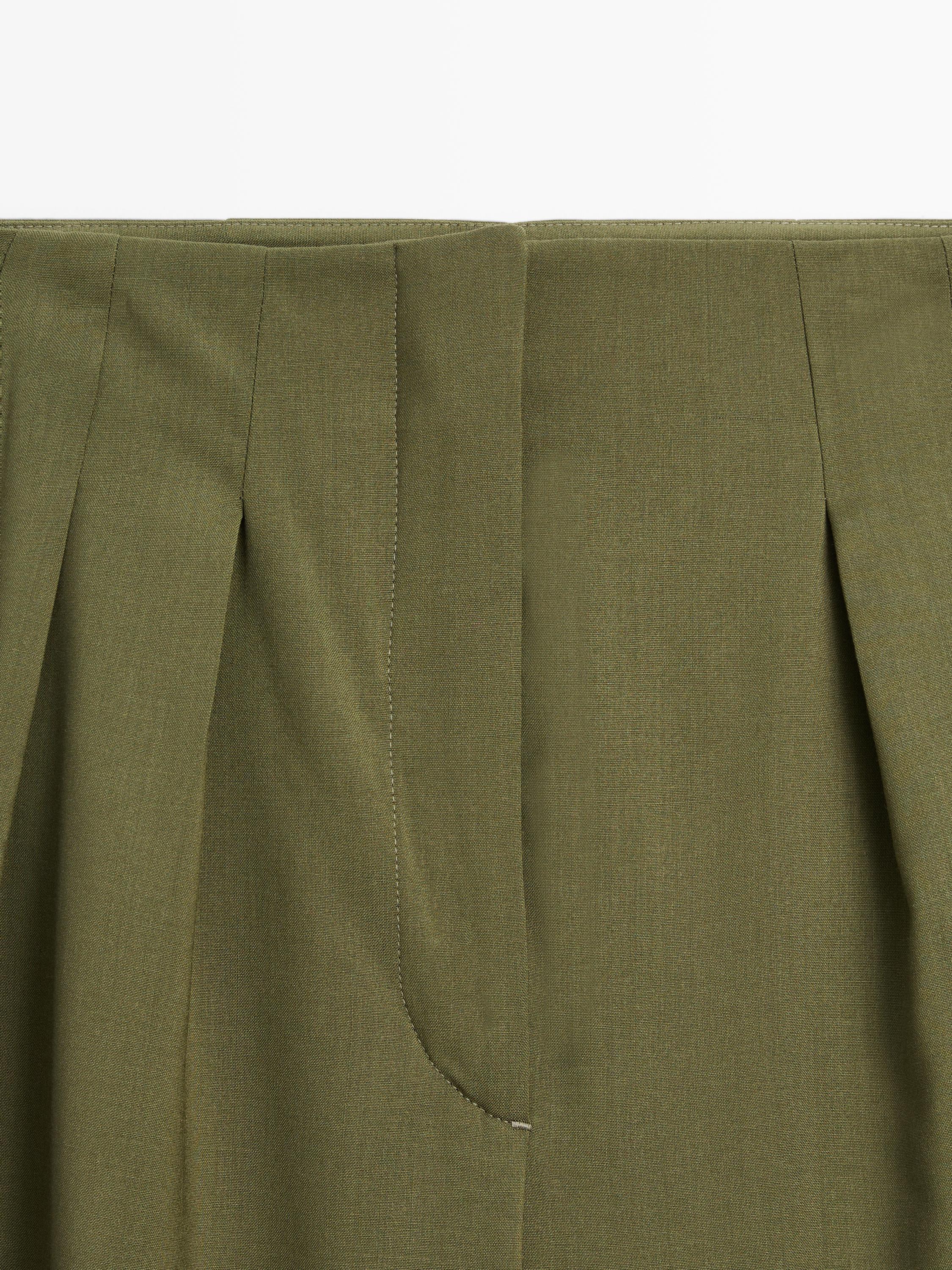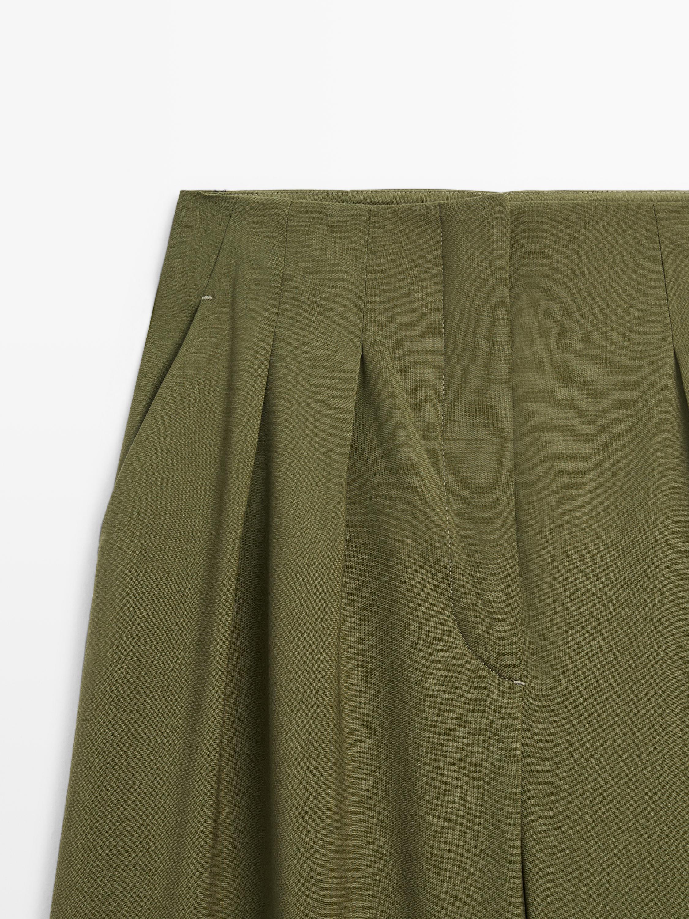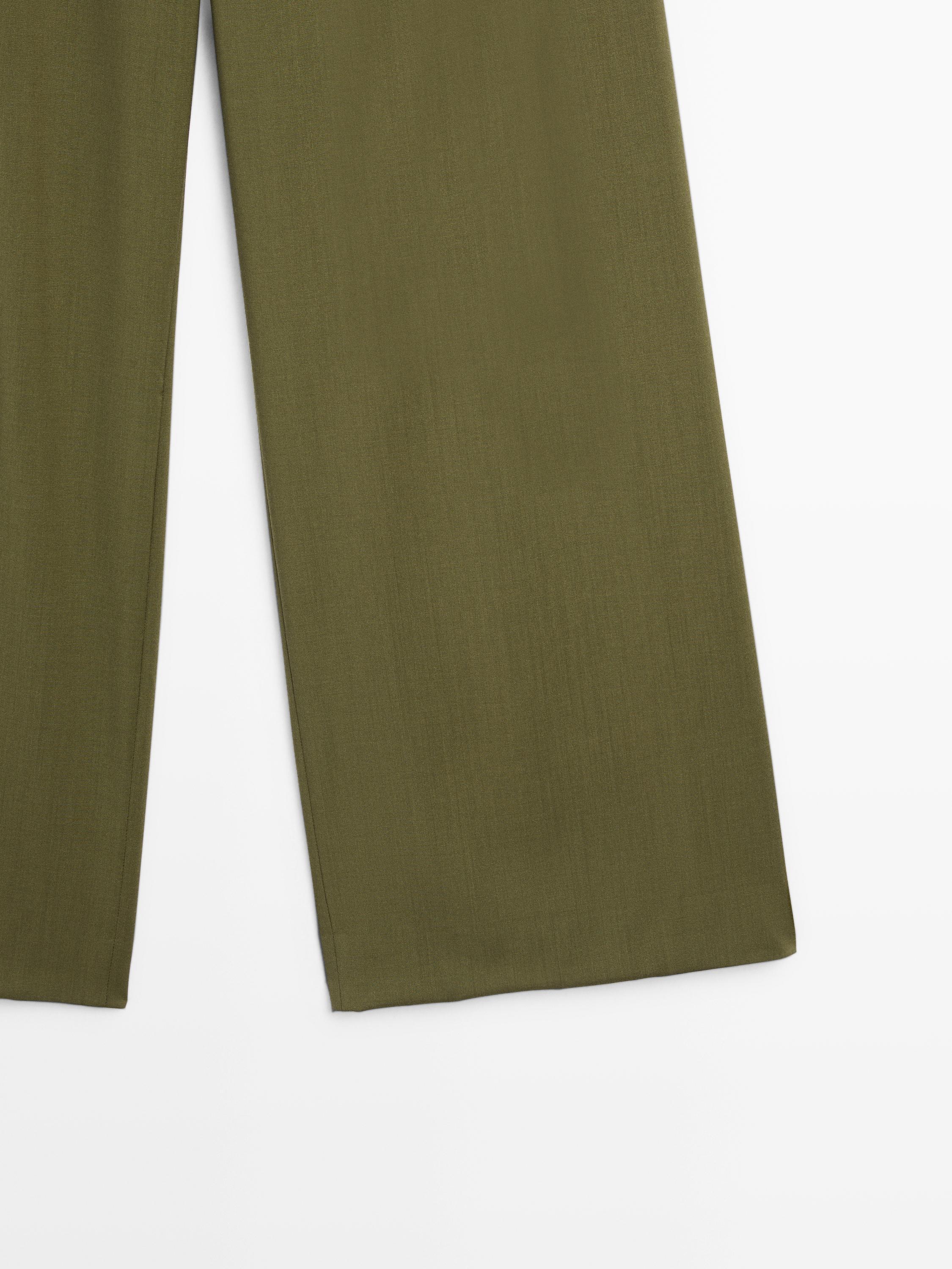 Брюки свободного кроя. Застёжка на молнию, скрытую под планкой, с застёжкой на крючок и пуговицу. Два боковых кармана. Два прорезных кармана сзади. Вытачки спереди. Изготовлены из 100% шерсти. Этот предмет одежды входит в комплект костюма.