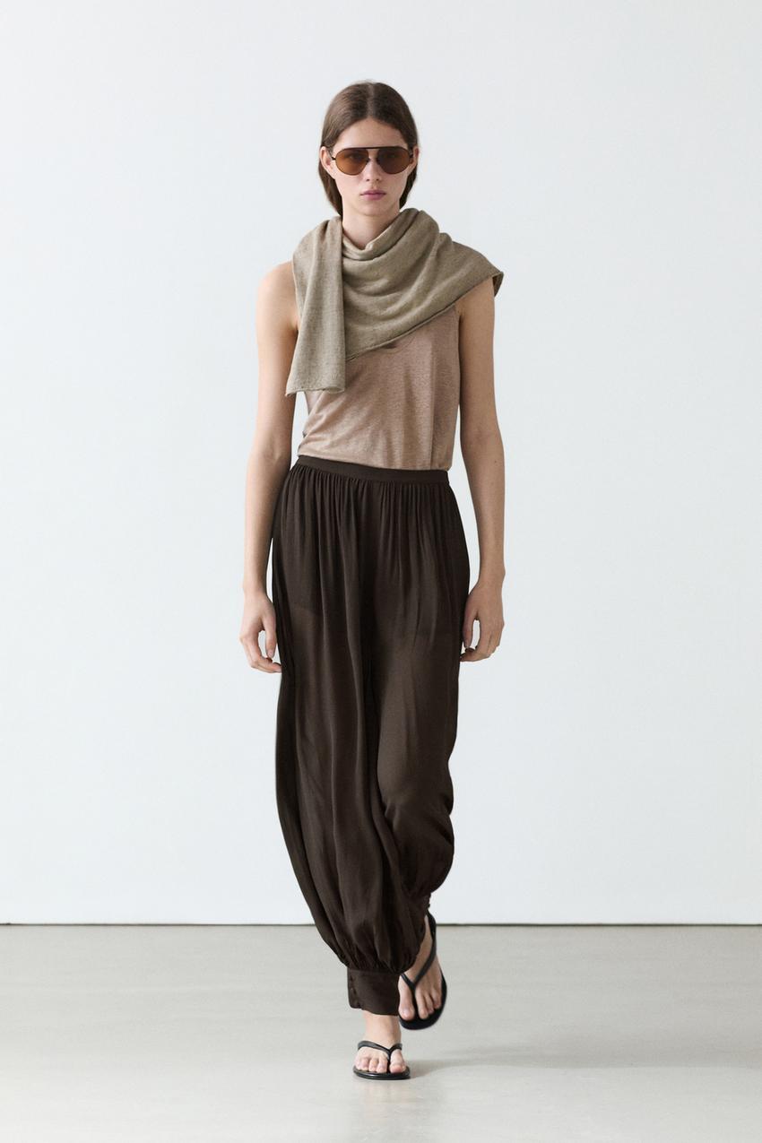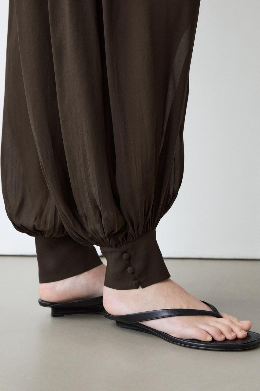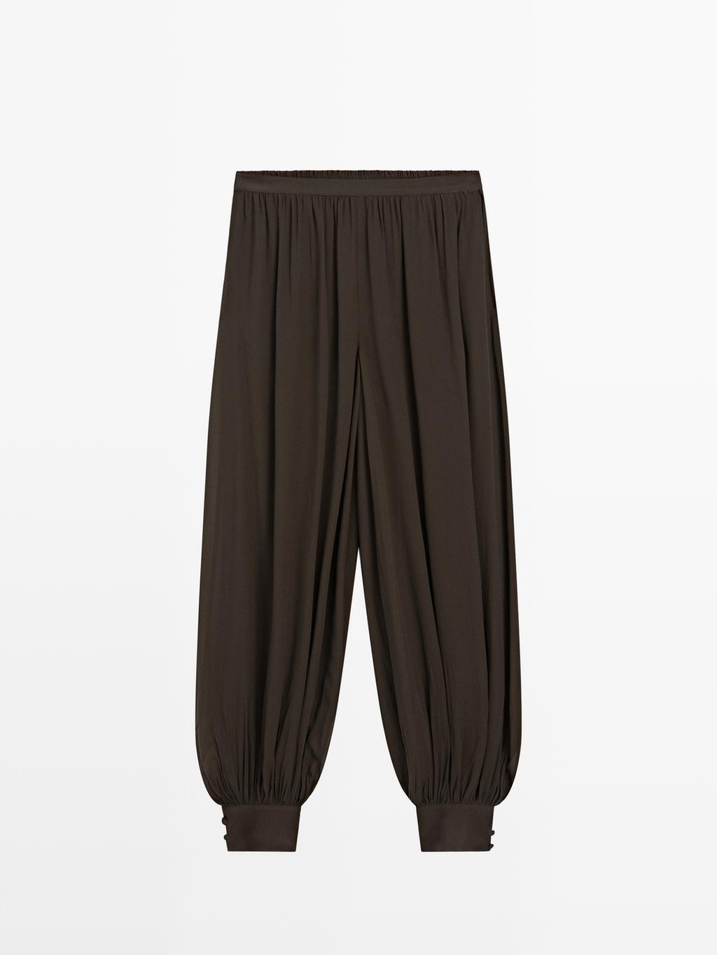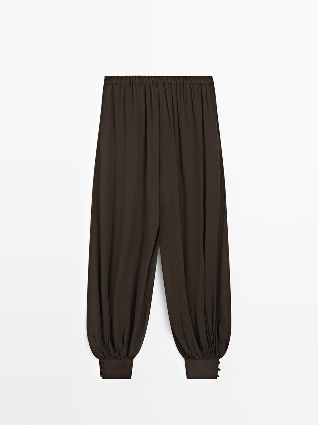 Брюки-саруэль: свободный силуэт, широкие штанины и посадка по щиколотку. Подкладка из той же ткани. Эластичная талия сзади. Низ с буфами и пуговицами. Струящаяся, полупрозрачная ткань.