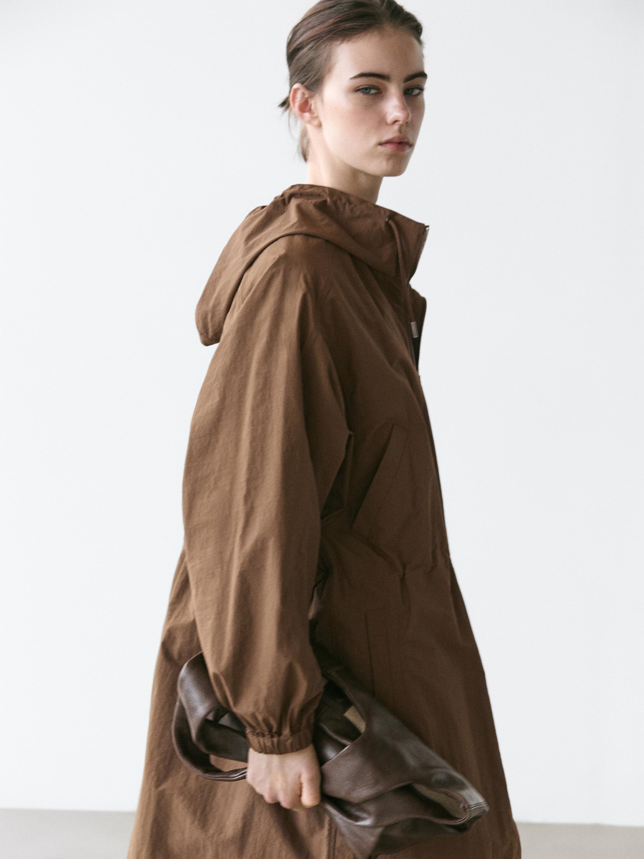 Длинная парка из высокотехнологичной ткани . Длинные рукава с эластичными манжетами. Застежка на молнию. Высокий воротник с капюшоном. Тонкий шнурок на поясе. Два боковых кармана.