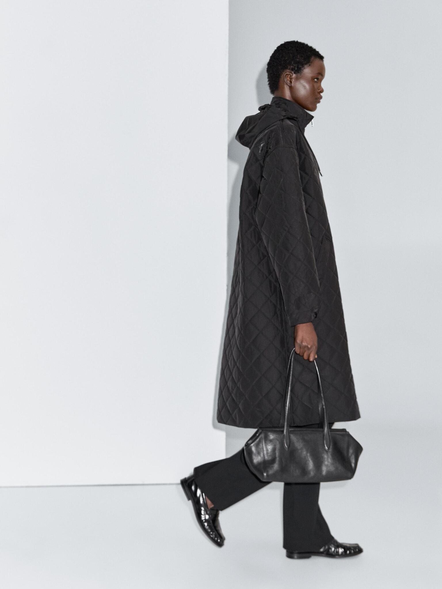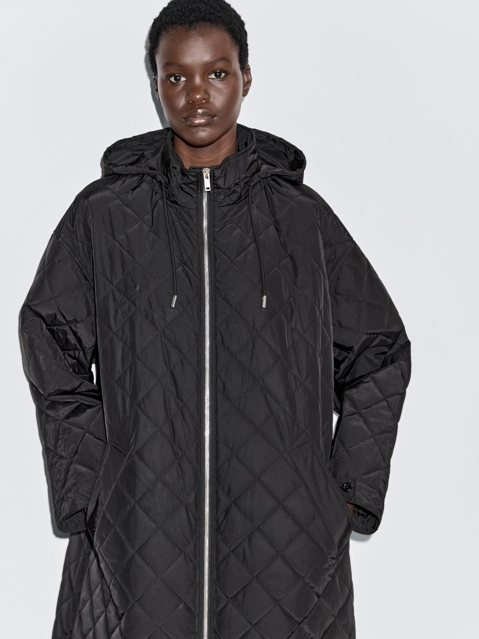Длинная утепленная парка оверсайз . Широкие длинные рукава. Манжеты с хлястиком и пуговицей. Застегивается на молнию с двойным бегунком.. Высокий воротник с регулируемым капюшоном. Потайной капюшон, который убирается в воротник. Два боковых кармана. Модель из стеганой ткани с принтом «Ромбы» и контрастными швами. Непромокаемая ткань.