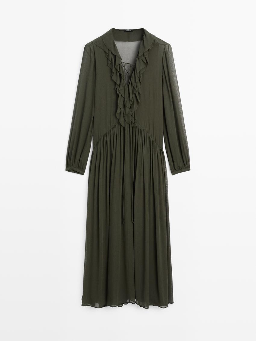 Massimo Dutti Длинное платье из струящейся ткани с воланом, темно-зеленый