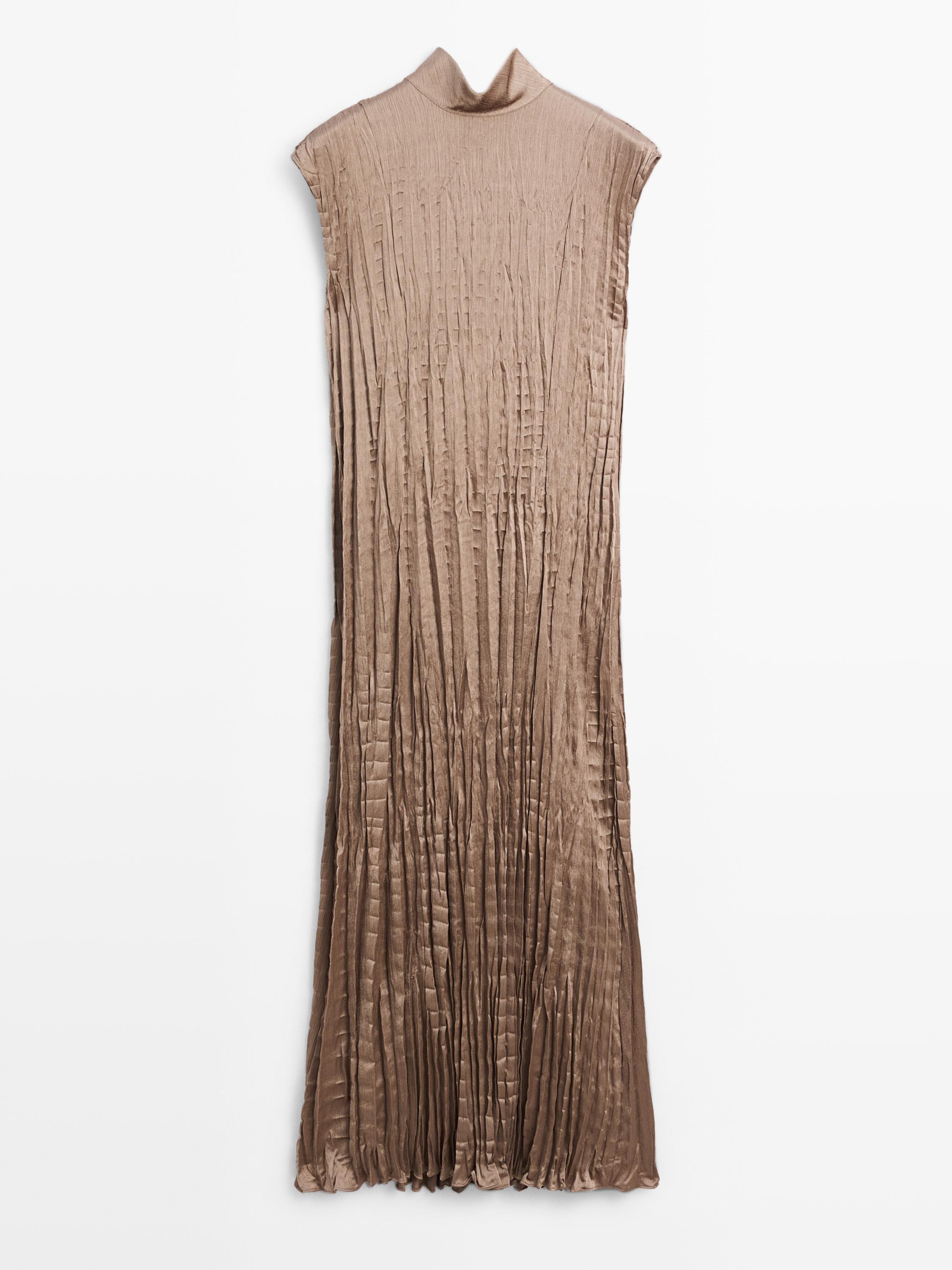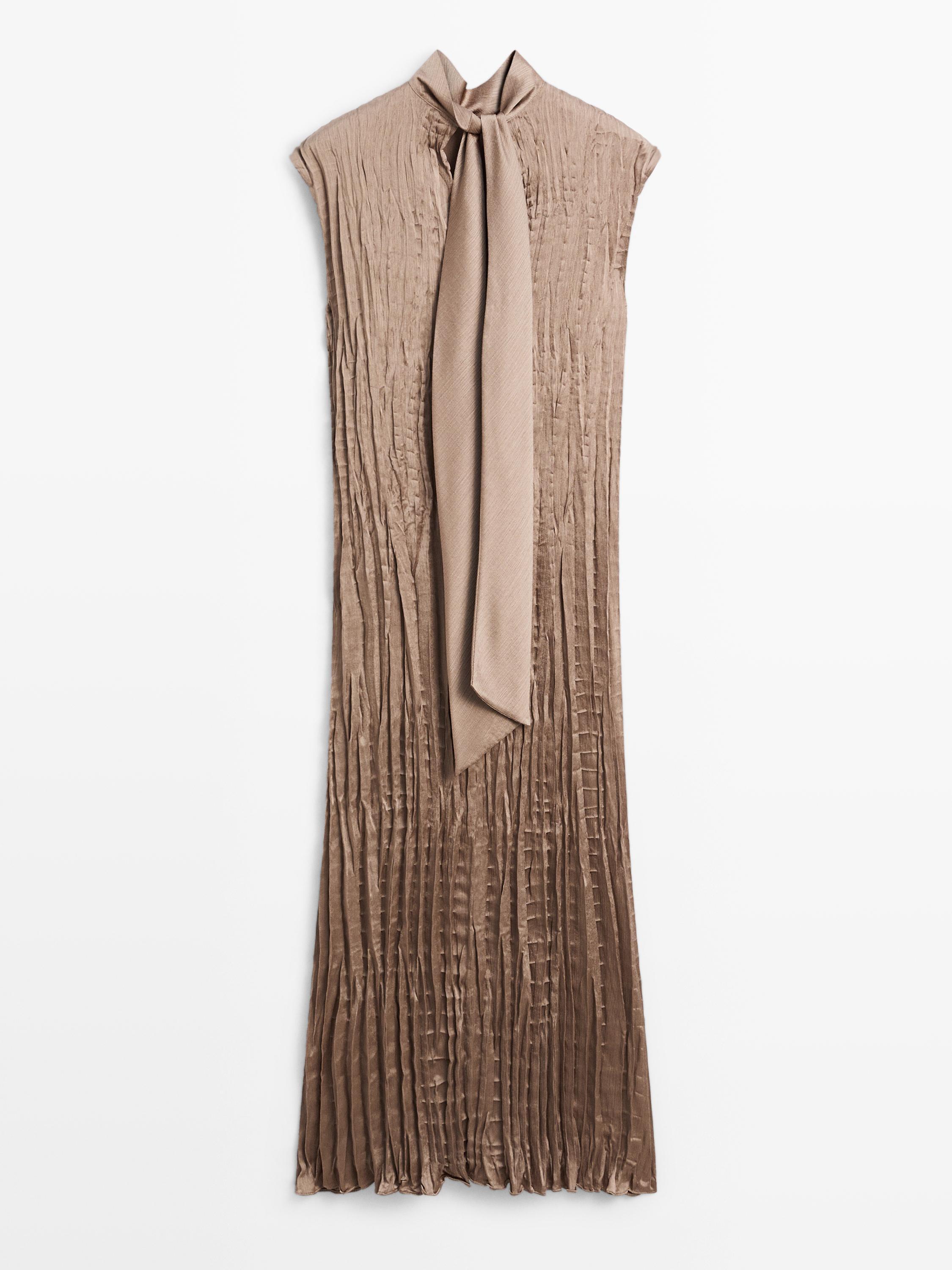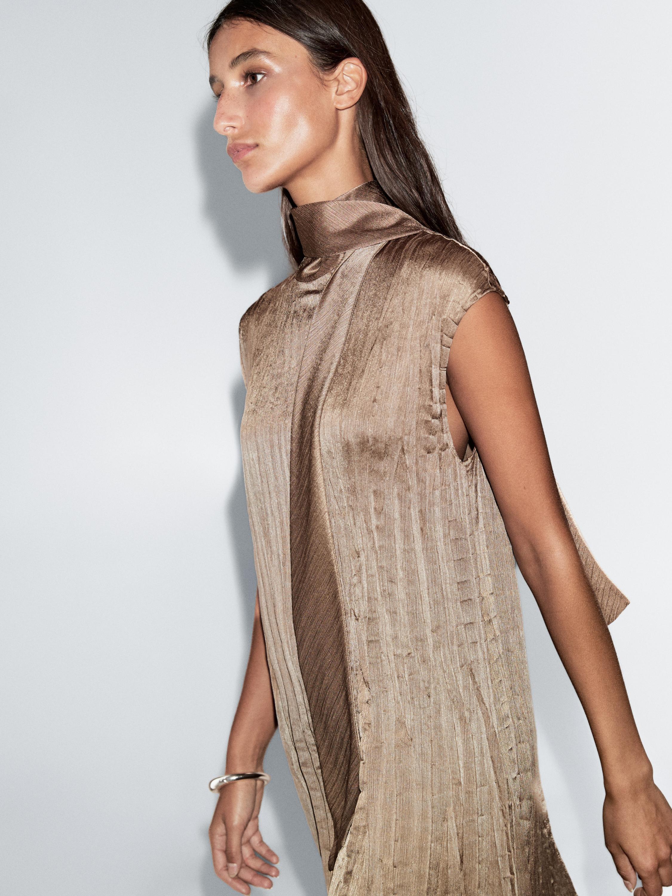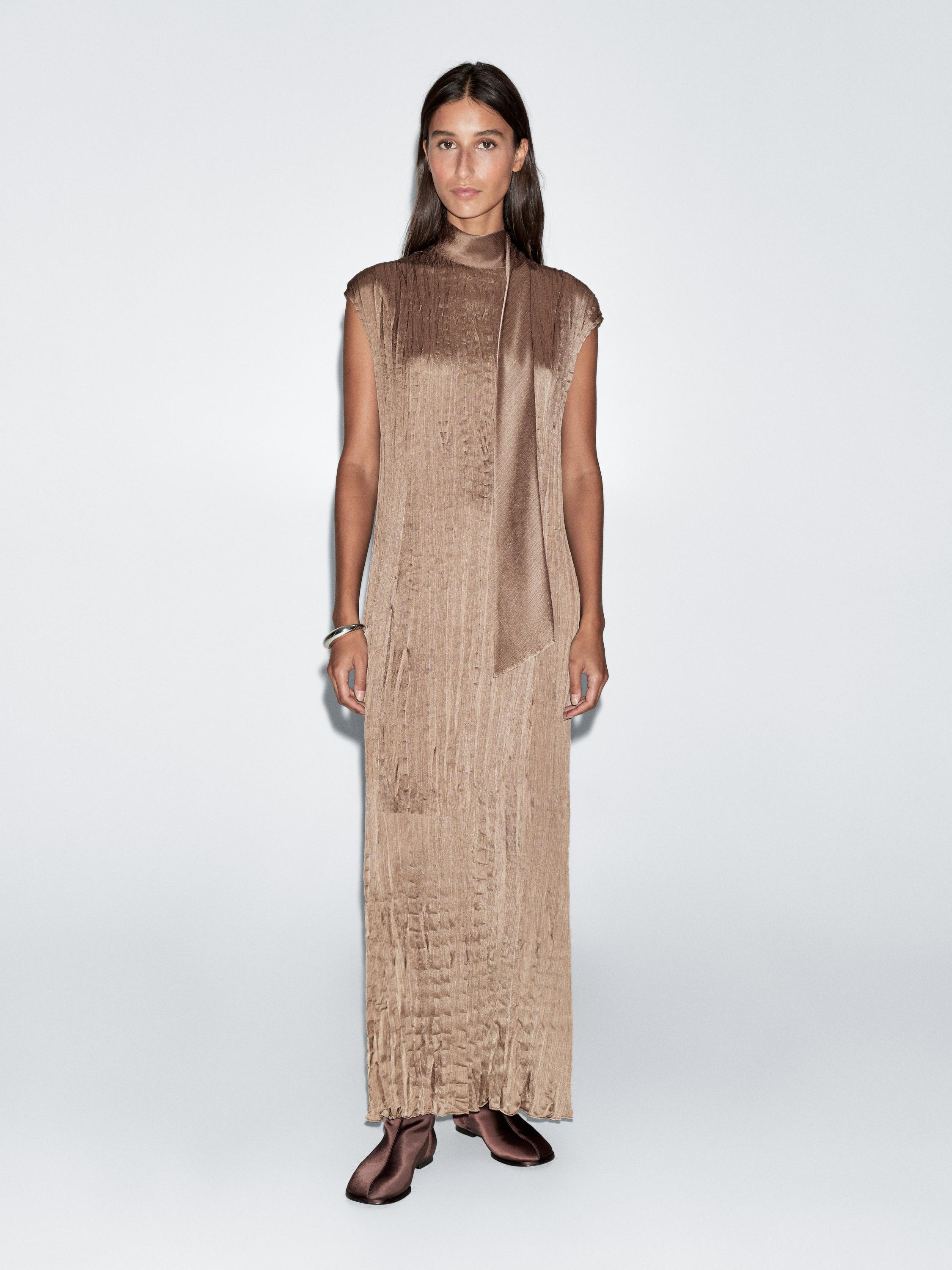Длинное платье с плиссированной отделкой. Без рукавов. Воротник на шнуровке.