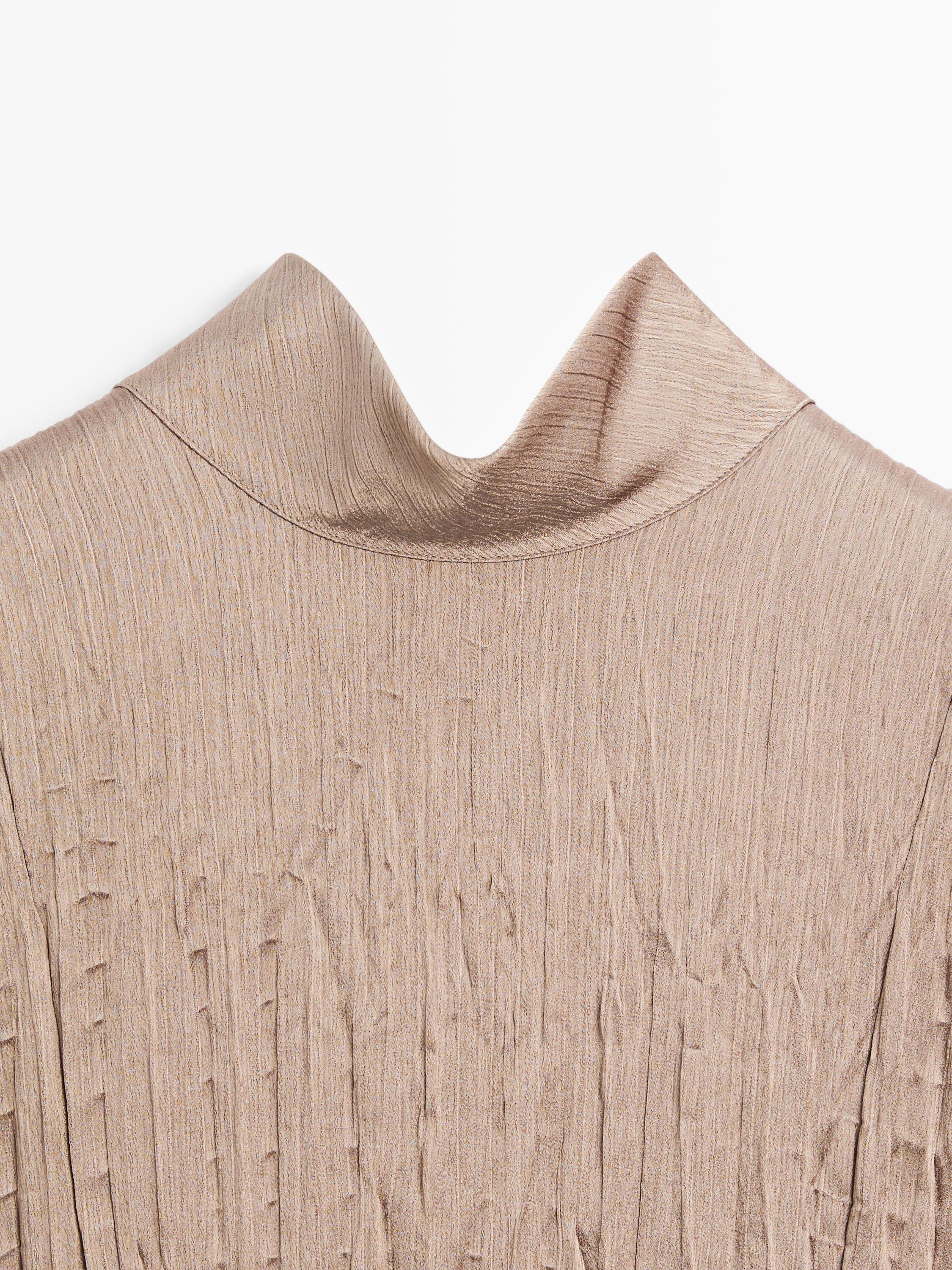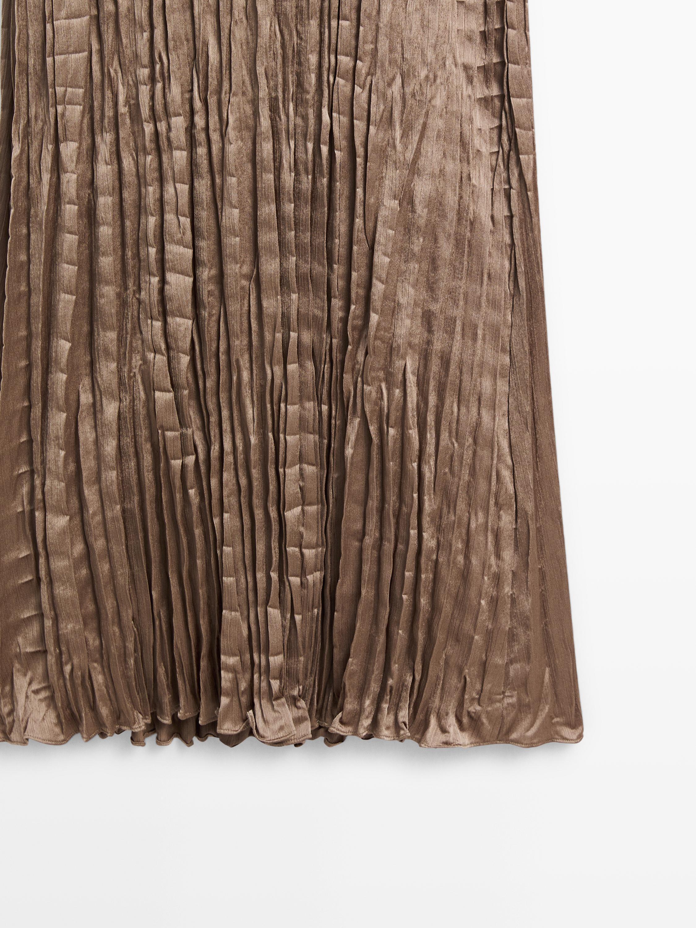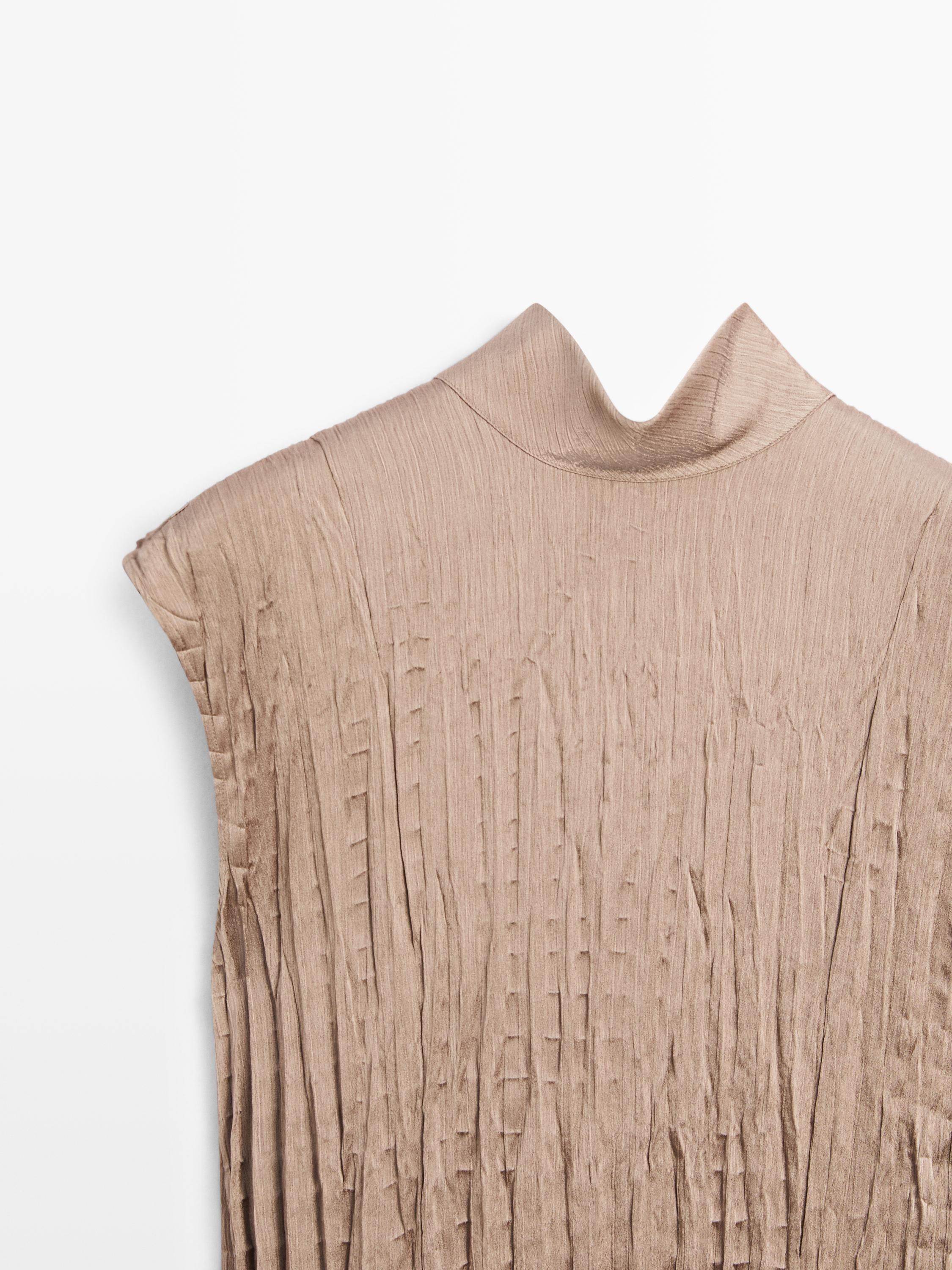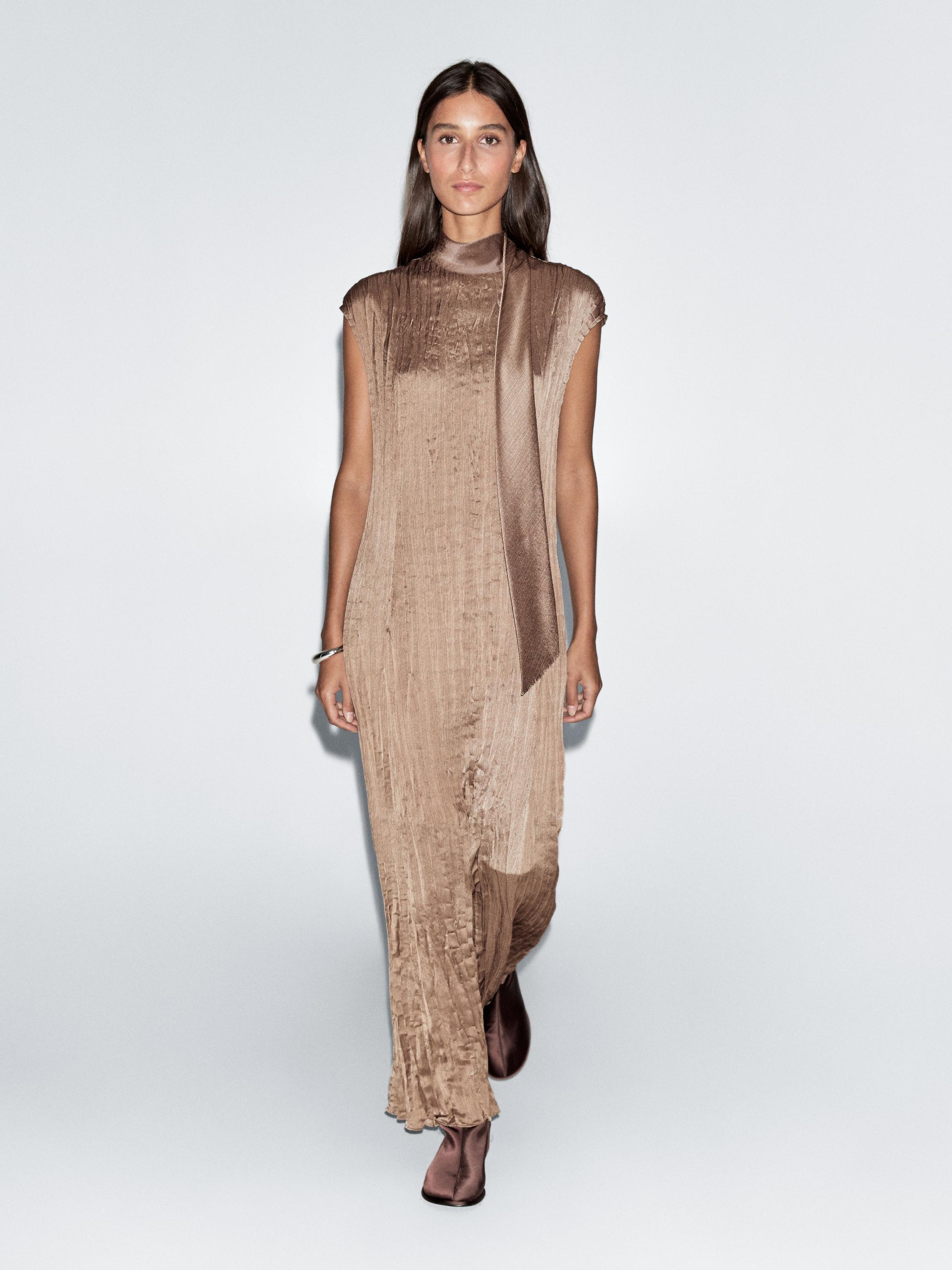 Длинное платье с плиссированной отделкой. Без рукавов. Воротник на шнуровке.