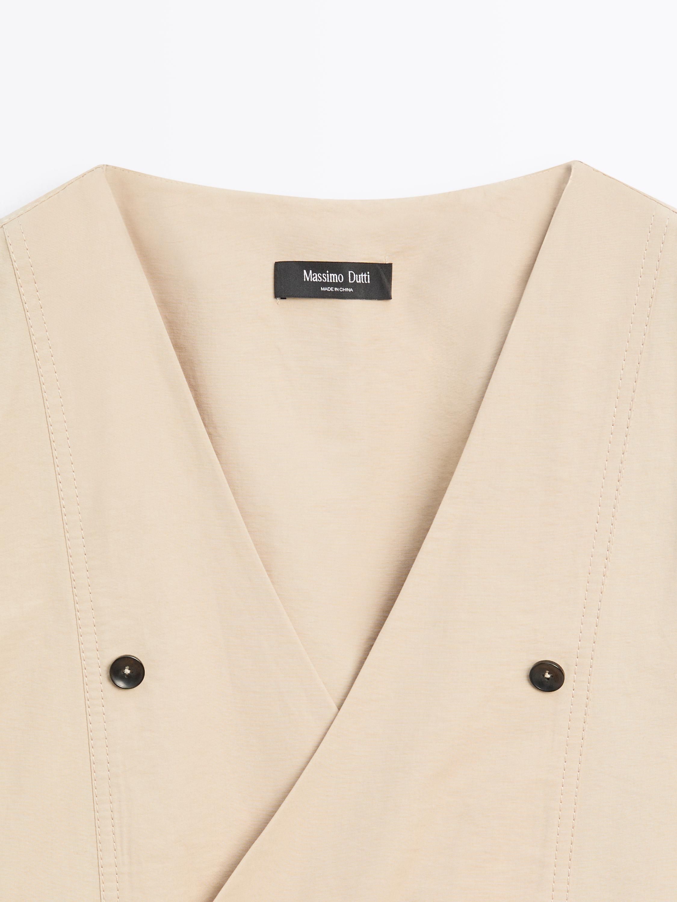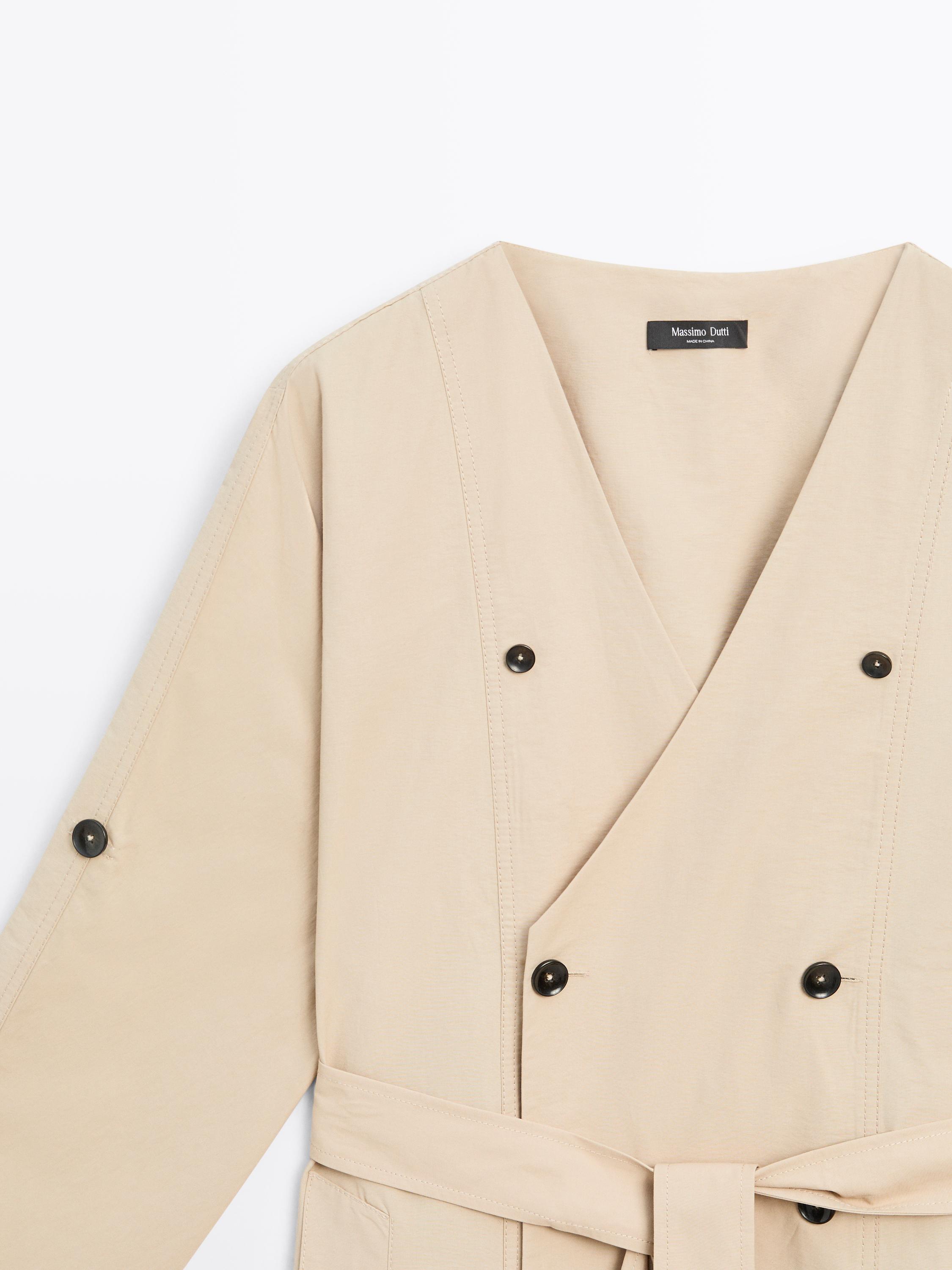 V-образный вырез. Отложные рукава. Двубортная застежка на пуговицы спереди. Боковые карманы на пуговицах. Изготовлено из смесовой хлопчатобумажной ткани. Пояс в комплекте.