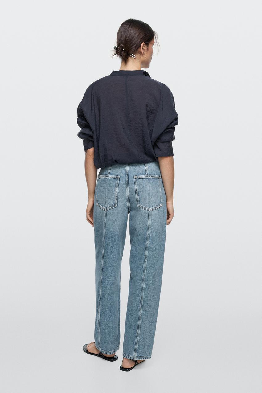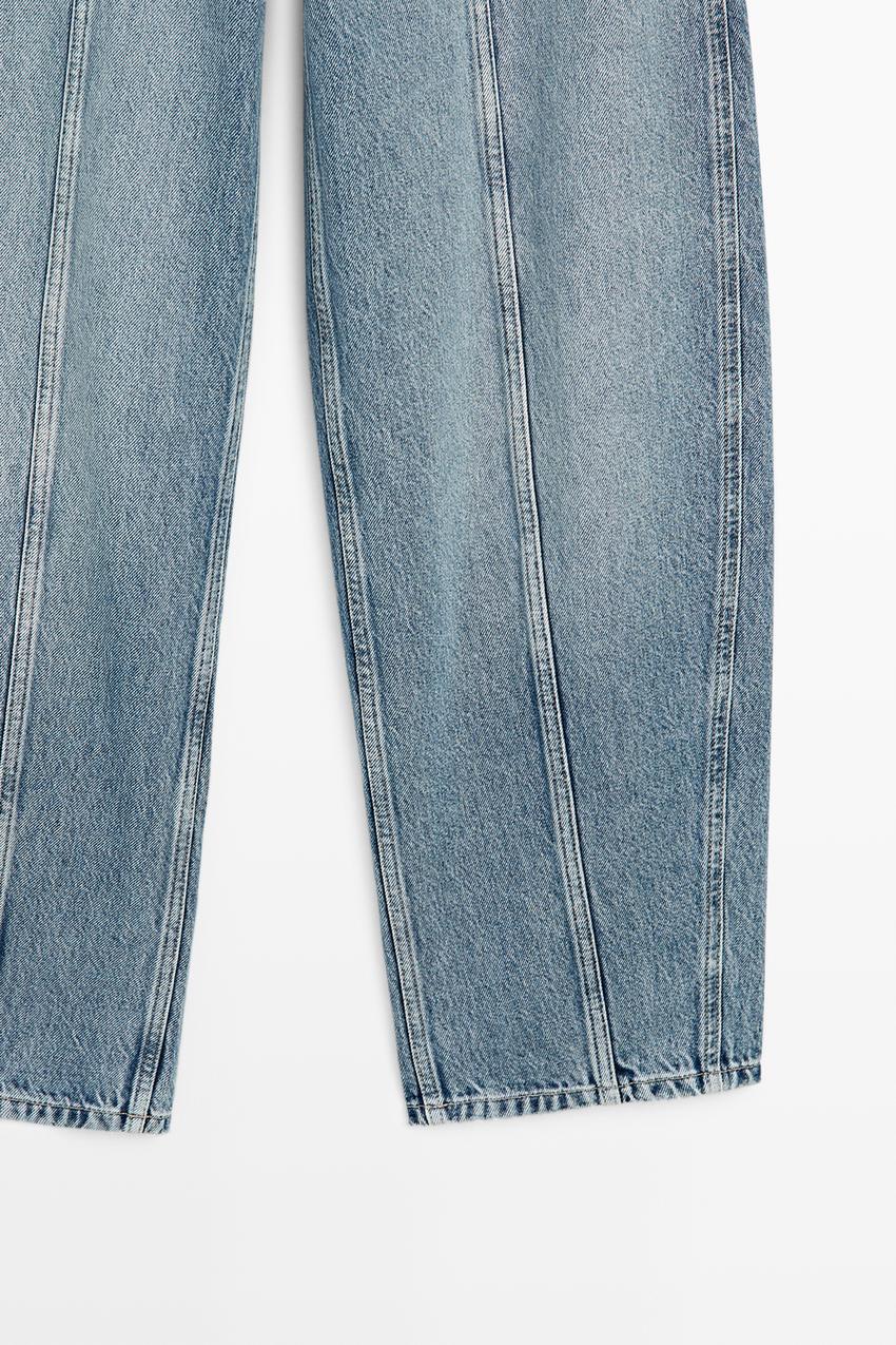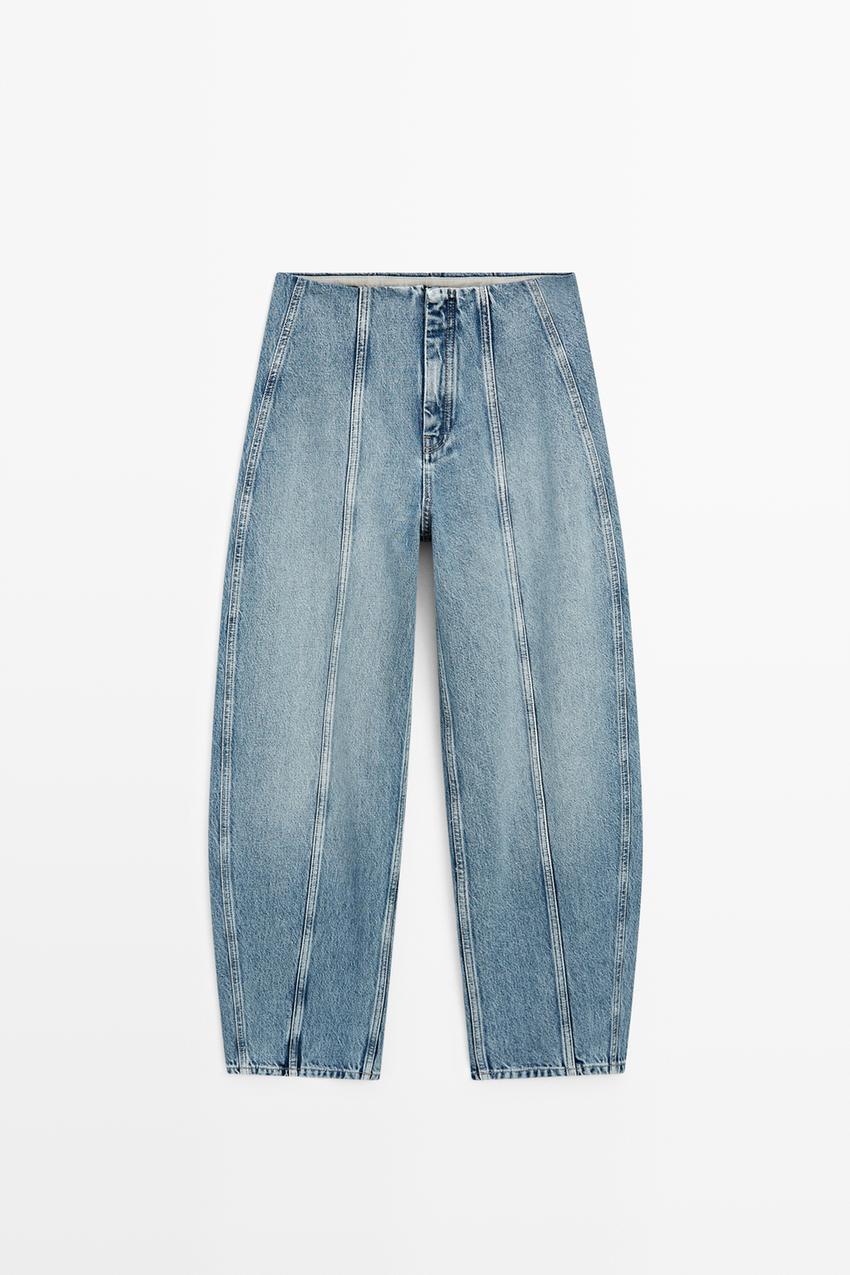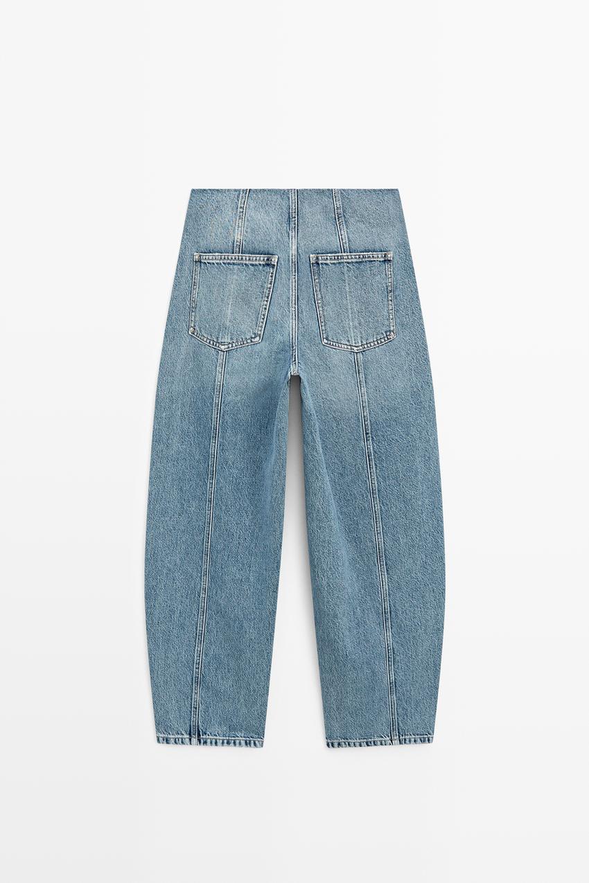 Джинсы Barrel Fit: этот крой имеет более широкую форму в бедрах и более узкие штанины к щиколотке, представляя собой промежуточный вариант между узкими и стандартными джинсами. Скрытая застежка на молнию и крючок. Пять карманов. Детализация швов.