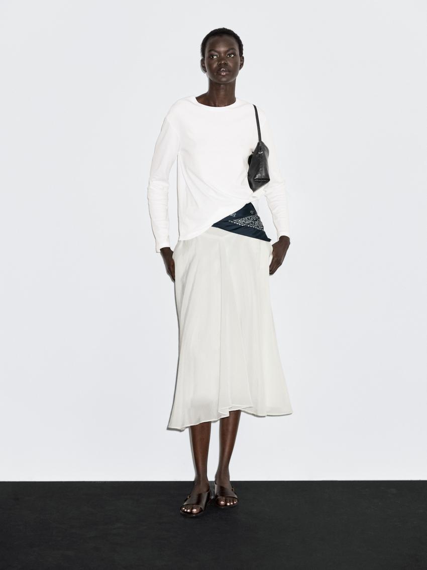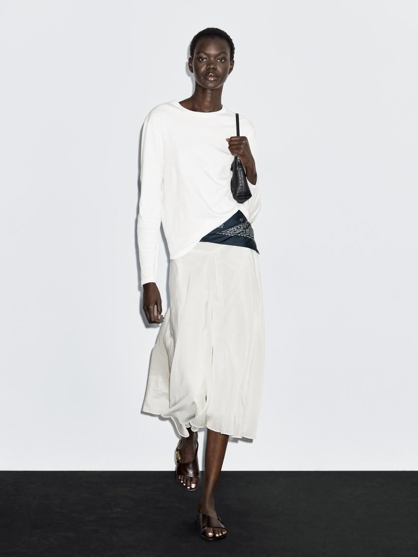 Футболка из мягкой, струящейся и слегка мерцающей ткани (100% хлопок). Круглый вырез горловины. Длинные рукава. Центральный шов на спине. Свободный и удобный силуэт, не приталенный.