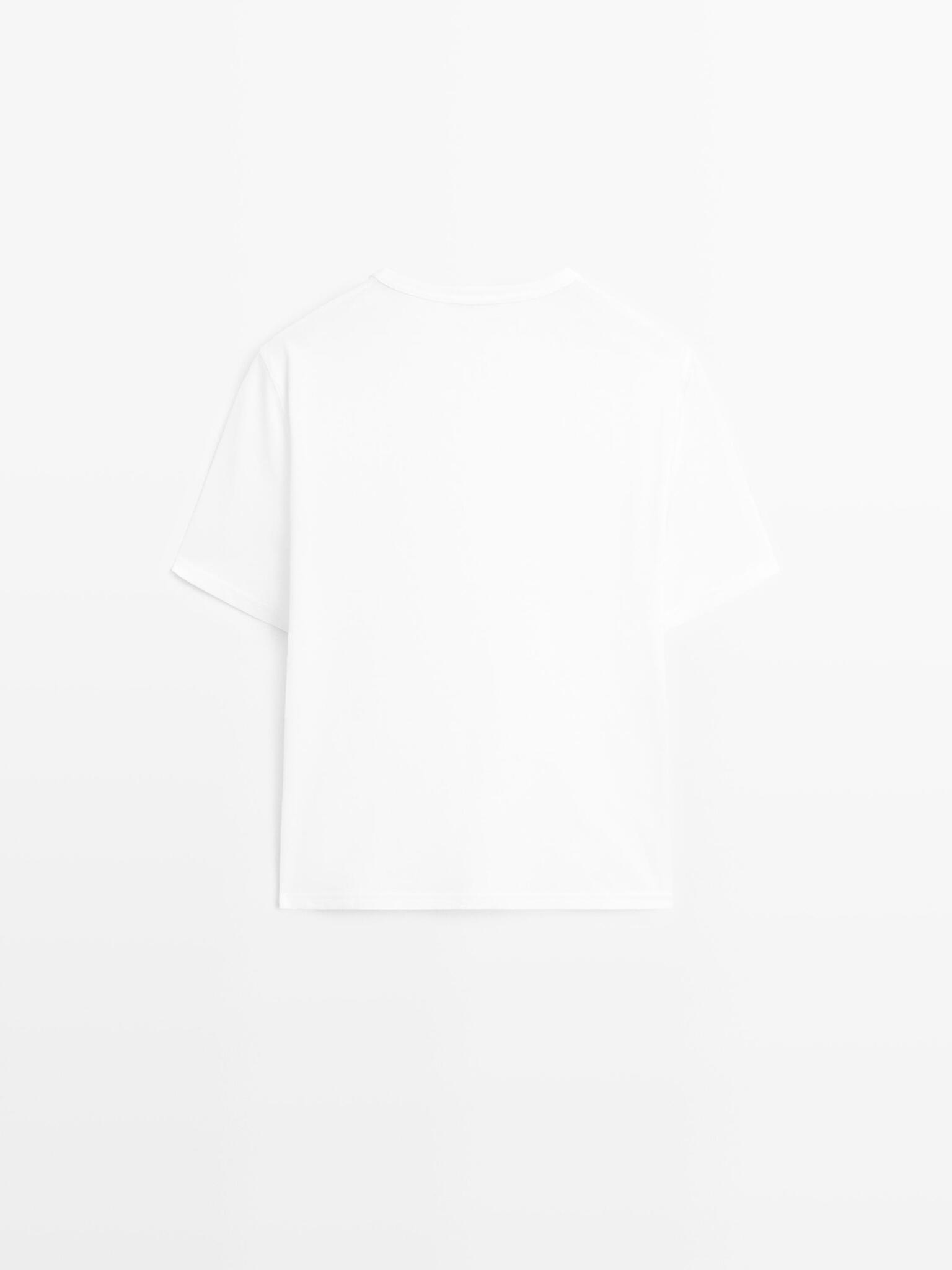 Футболка из смесового хлопка. Круглый вырез. Короткие рукава. Эта модель короче, чем обычно..
