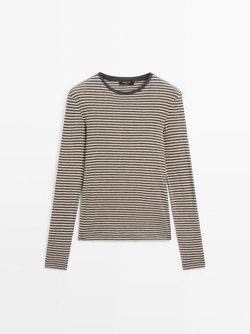 Футболка из смесового хлопка. Круглый вырез. Длинные рукава. Контрастный воротник. Принт в полоску.