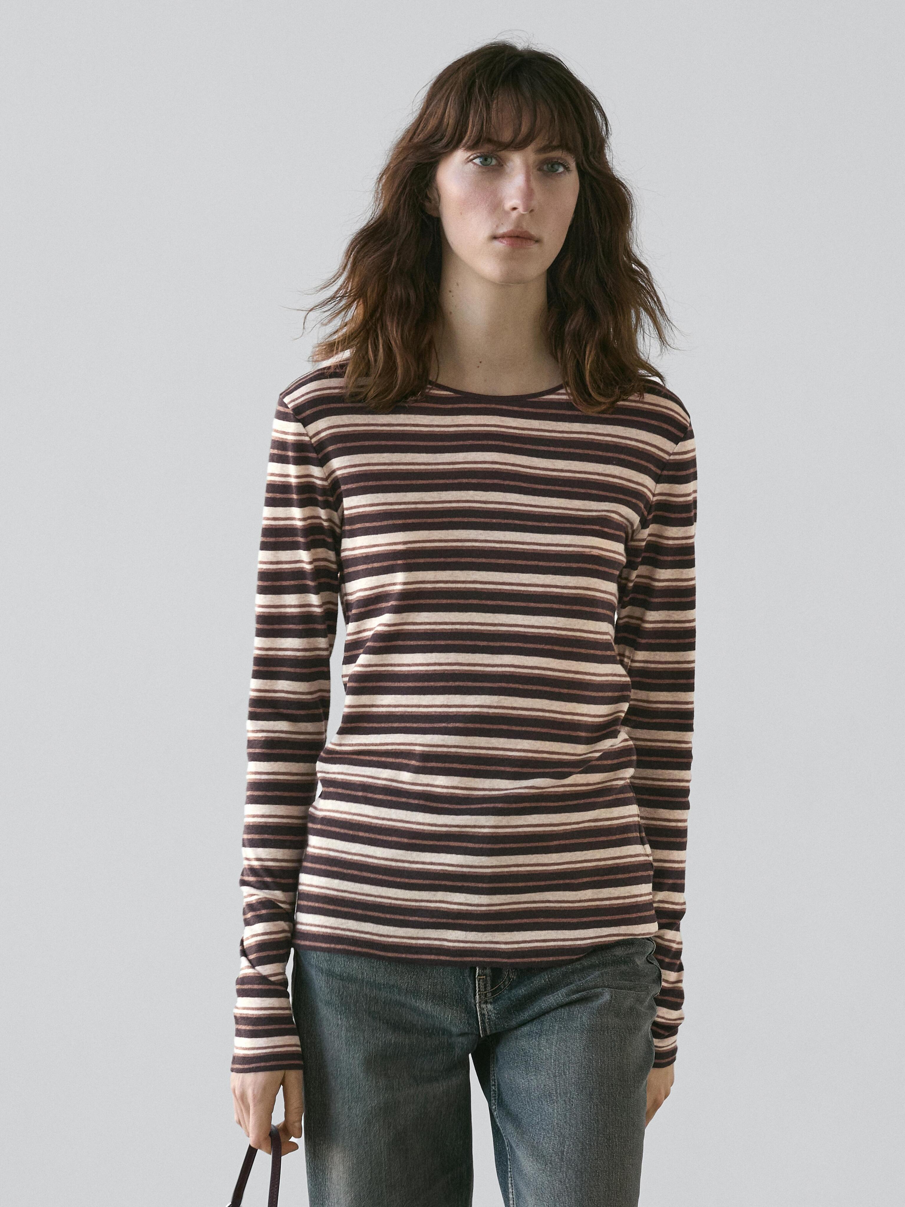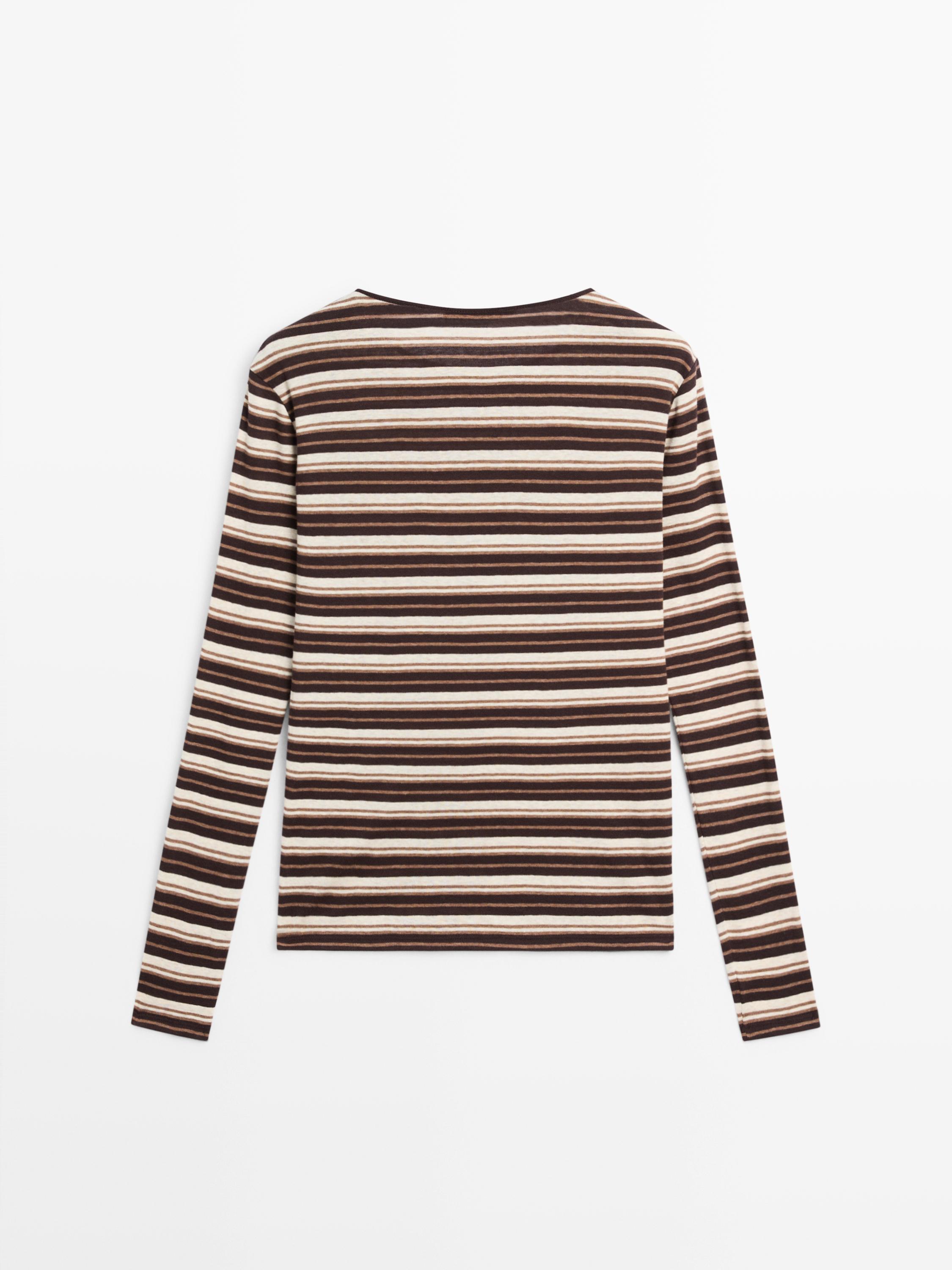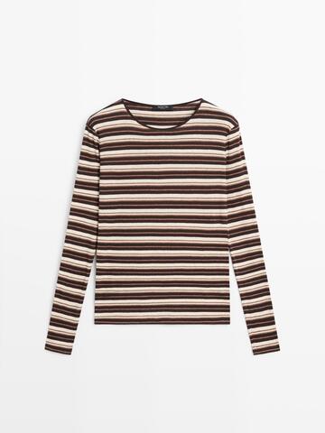 Massimo Dutti Футболка из смесового хлопка в полоску с длинными рукавами, коричневый
